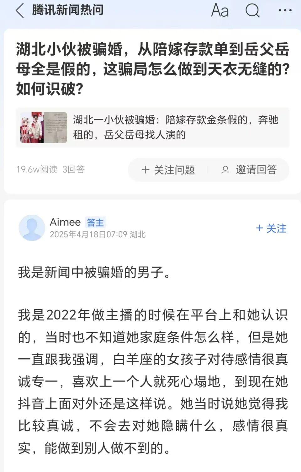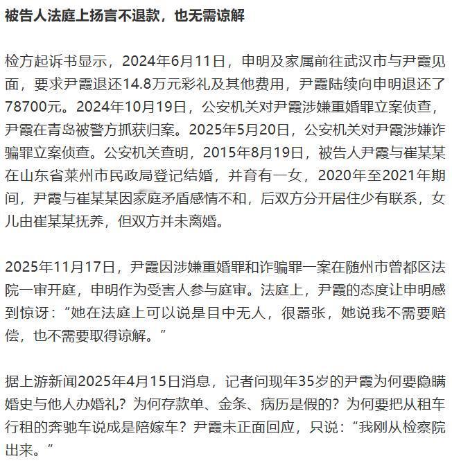 湖北随州 26 岁的申明(化名)真是倒了大霉!2024 年 5 月办的一场婚礼,从头到尾全是骗局,娶的 “新娘” 尹霞(化名)就没一句真话。 两人 2022 年在短视频平台认识,尹霞自称 1994 年生、家境优渥,父亲是青岛高官,还多次发假 B 超单谎称怀孕又流产,哄得申明团团转。谈婚论嫁时,申明家按风俗给了 14.8 万现金彩礼,尹霞承诺的陪嫁更是诱人:46 万存款单、100 克金条,还有一辆奔驰车。就连婚礼上的 “岳父”“岳母”,都是她花钱请来的演员,连婚纱照都是合演的戏。 可婚后尹霞一直推脱领证,说自己 “犯过事” 能找关系搞定。后来两人闹矛盾,尹霞要回青岛,申明让她退彩礼,这才露了馅:奔驰车是租的,金条一刮就露出白色,存款单查无此信息,连尹霞的名字、年龄都是假的 —— 她实际 1989 年生,比申明大 9 岁,当时还没和前夫离婚,属于重婚! 原来尹霞早就把 14.8 万彩礼存进自己账户,假陪嫁都是网购的,“哥哥” 也是找情感博主假扮的。2025 年 11 月 17 日案子开庭,尹霞只认重婚罪不认诈骗,还嚣张放话 “不退款、不要谅解”。目前案子没当庭宣判,申明和家人盼着能严惩骗子,追回剩下的彩礼。 这事儿也给大家提了醒:网恋谈婚论嫁,涉及钱财和身份信息,可得多留个心眼,别被 “富家千金” 的假象骗了!