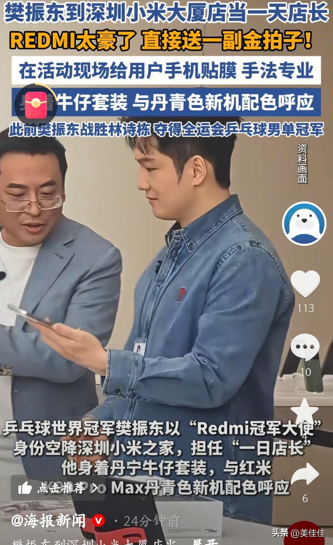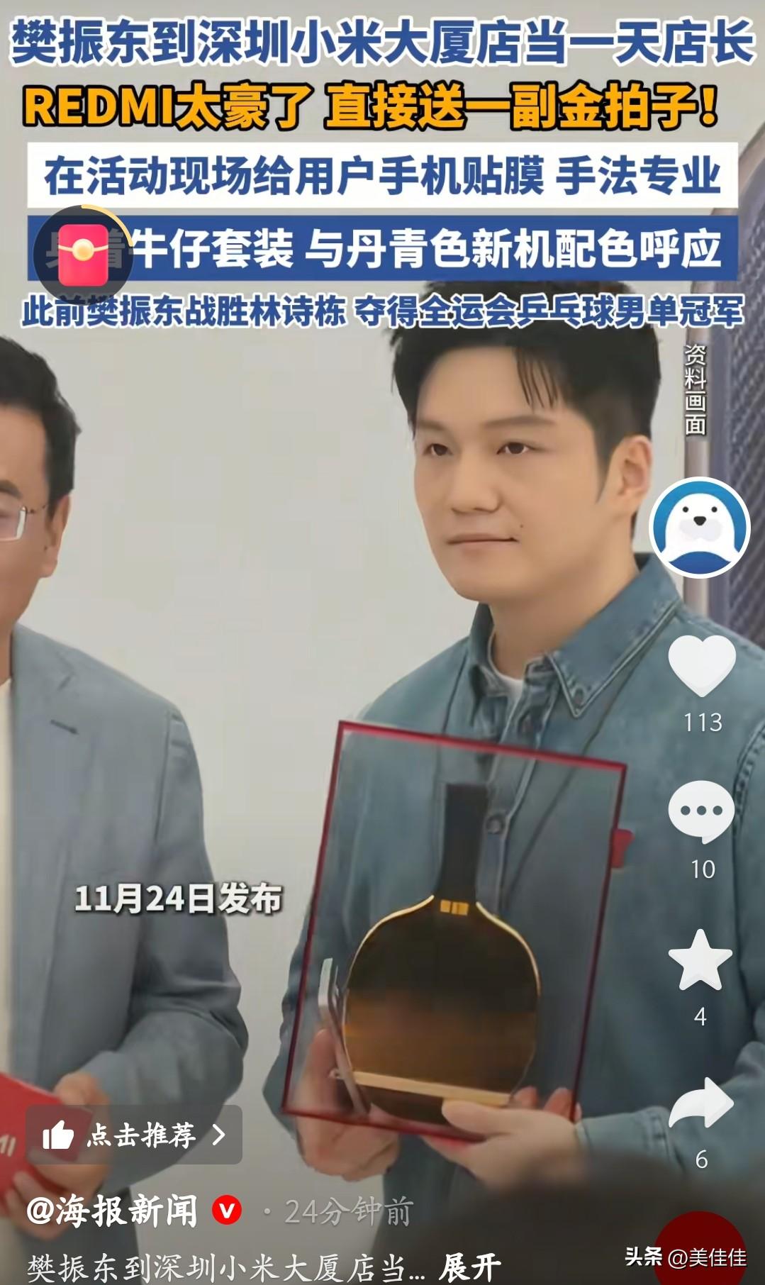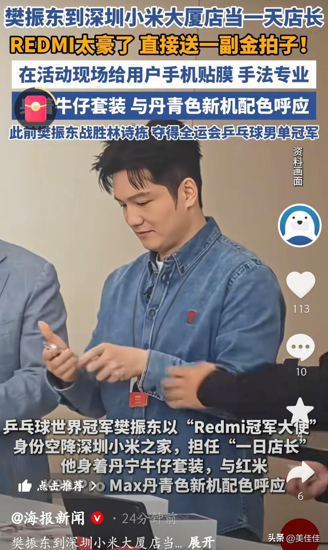 樊振东当小米店长,直接被送金拍子谁能想到世界冠军也能当手机店店长?今天樊振东直接空降深圳小米大厦店当“一日店长”,现场给用户贴手机膜那手法比店员还熟练,网友直呼“这业务能力能直接入职了”! 他穿的牛仔套装刚好和红米新机的丹青色配色撞了款,主打的就是一个“官方应援”。最豪的是,Redmi直接送了他一副金乒乓球拍——这排面,不愧是冠军大使! 之前他刚拿了全运会男单冠军,现在又来跨界当店长,既能打球又能卖货还会贴膜,这是什么全能型选手啊? 现场围观群众怕不是要挤破头,毕竟能让世界冠军亲手贴膜,这手机膜都能当传家宝了吧!