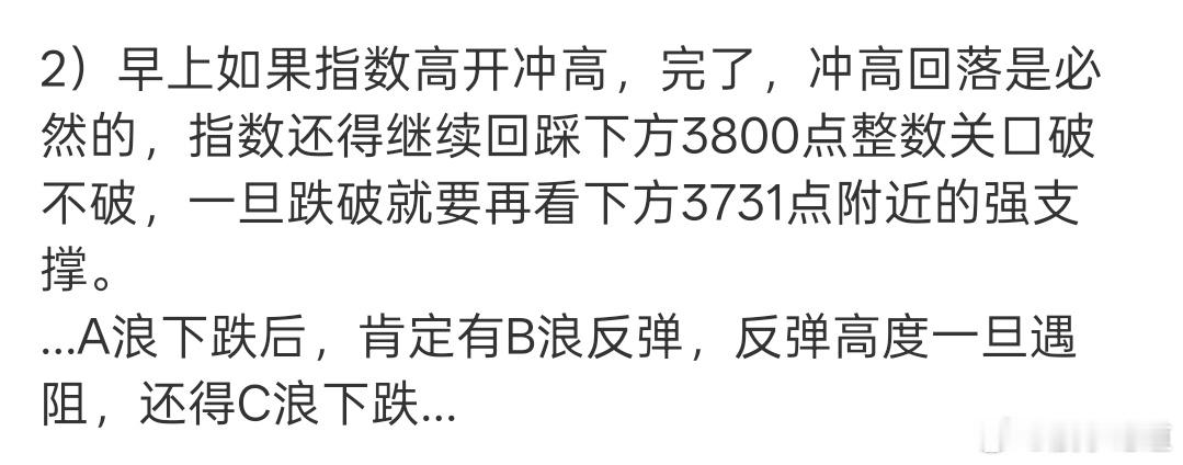 早上指数高开冲高回落,缩量的冲高没意义。好,那走势既然符合早报应对策略的第二种,接下来就看下方3800点整数关口能不能守得住了。如果指数回踩3800点不破,会迅速展开一轮B浪反弹,反弹的空间应该有80点左右,也就是上方的60日均线,能带量继续往上看高回补缺口3927点附近。如果无量的反弹就得看C浪下跌,C浪下跌的位置大概在3731点附近,这里有很强的支撑,然后指数在这里做个大双底,蓄力后再开启一轮新的主升行情。不管后市怎么走我都可以接受的,因为我知道大哥在为明年春季行情做准备,没什么可说的,技术好的中间有反抽可以做T,技术差的别乱动。老牛我对于后市依然很乐观,牛市还在…建仓:值得买