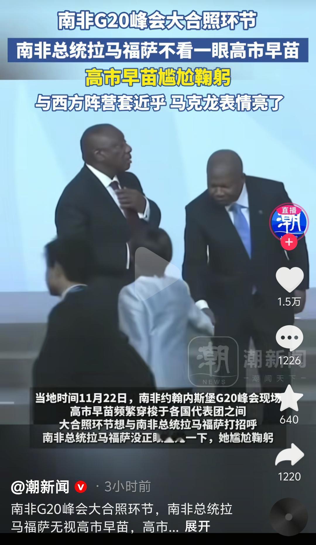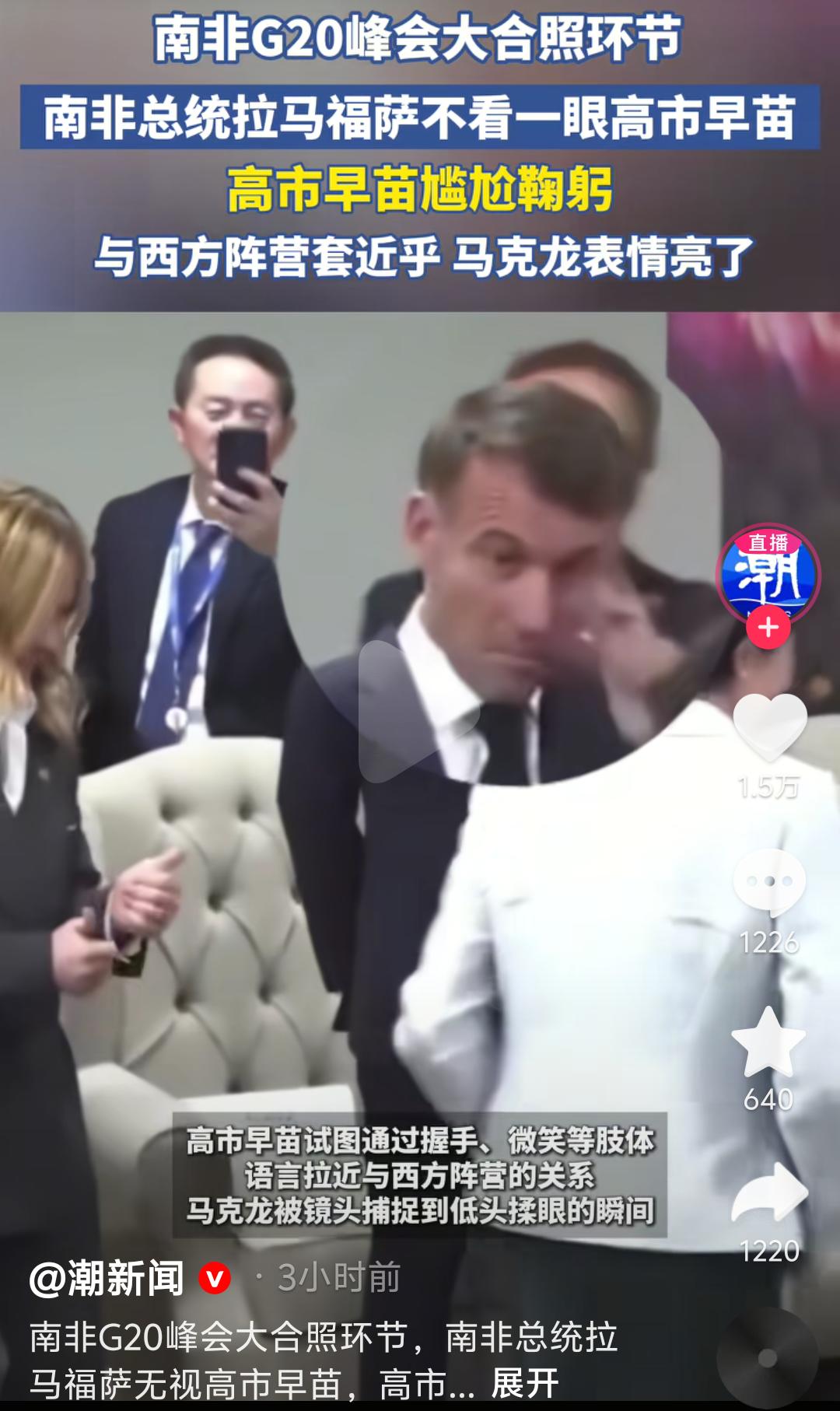 南非总统:小马,日本那个首相长得那叫一个怪异,听日本网民说,她是从风俗店出来的。 马克龙:确有此事。待会儿凑近瞧瞧她长啥样。 …… 南非总统:我的天呐,长成这样,实在没法看。 马克龙:看不见我,看不见我。