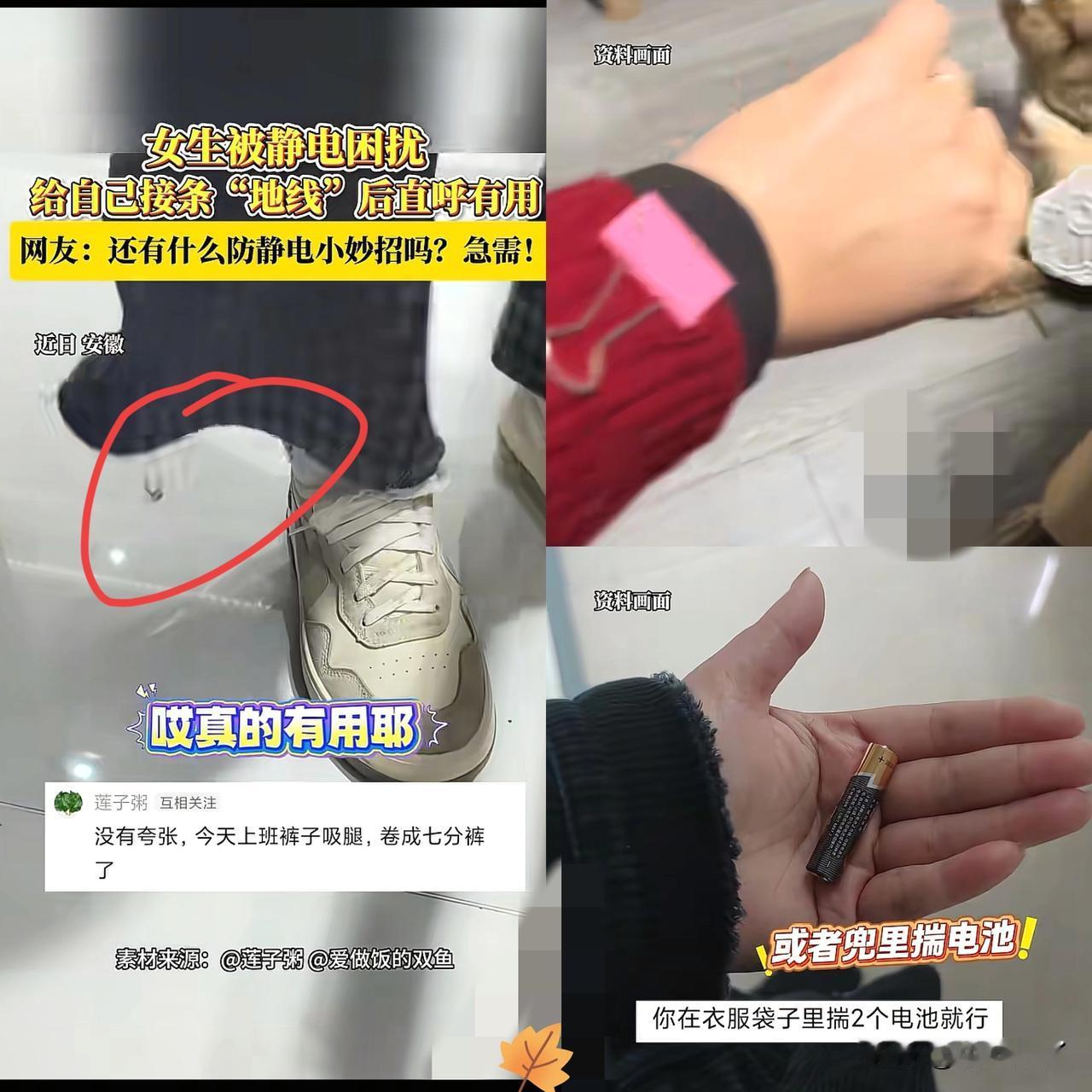 太有头脑了!安徽一女子被静电困扰,几乎天天都被电,她灵机一动,竟然拿3个曲别针串成串别在裤腿,一分钱没花,竟把冬天的“静电魔咒”治得服服帖帖,再也不用忍受粘腿、触电的尴尬! 谁冬天没被静电虐过?穿脱毛衣头发炸成鸡窝,摸门把手被电得跳脚,加绒裤粘在腿上走路磨得慌,偷偷拽裤腿的样子简直社死现场! 女子凭着物理知识,用曲别针做“简易地线”,靠金属导电把静电导去地面,这波活学活用,比那些贵价“黑科技”管用10倍! 其实冬天防静电根本不用瞎花钱,钥匙尖碰车门放电、摸墙消电、开加湿器增湿,都是低成本妙招! 比起跟风买网红产品,生活里的小智慧才是解决问题的王道,关键是肯动脑子琢磨! 你们还有什么防静电的妙招吗?欢迎分享!