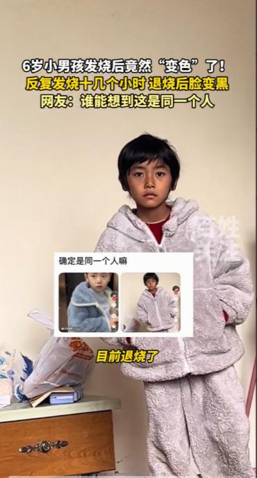 “彻底解释不清了!”,湖南,6岁男孩反复发烧十几个小时后,脸从白色直接变成了黑色。妈妈懵了,说其他方面都恢复的挺好,就脸太黑了,希望大家能告知怎么样才能变白。网友:没吃过烧烤吗?肉被高温烧过就会变黑! 据22日百姓关注报道,男孩退烧后,除了肤色还是黑了没白回来,其他方面已经恢复正常了,难道真如网友所说,是被高温烧黑了? 其实这不是 “烧黑”,而是高烧引发的 “炎症后色素沉着”,是身体免疫系统打仗留下的 “后遗症”,看着吓人实则没啥大事。 人体又不是生肉,蛋白质变性变黑那得达到 100℃以上的高温,发烧最高也就 40℃出头,根本到不了那程度,要是真能把皮肤 “烧黑”,那身体组织早该坏死了,哪能退烧后啥事儿没有? 真正的原因的是 “炎症后色素沉着”,简单说就是身体在对抗病毒、细菌的时候,免疫系统开足马力打仗,产生的炎症因子会刺激皮肤里的黑色素细胞 “加班加点” 生产黑色素,只能沉积在皮肤表层,尤其是发烧时血液循环快,面部皮肤又薄,色素沉着更明显,看起来就变黑了。 这种情况在儿科太常见了,是正常反应,一段时间后自己就白回来了,根本用不着什么特殊的 “美白手段”。 之所以有的小孩发烧不变黑,就他变黑,其实跟个人体质有关,就像有的人容易晒黑,有的人晒半天也没啥变化,皮肤里的黑色素细胞活跃度不一样。 妈妈急着让孩子变白的心情能理解,但真没必要瞎折腾,更别给他用大人的美白产品,那些东西里的酒精、果酸成分,会刺激孩子娇嫩的皮肤,反而可能引发过敏。 网友的调侃虽然好笑,但足以看出很多人对这种情况都不了解,甚至会被误导,下次再遇见这种情况,除了求助网友,更要找到专业的医生,真相就一清二楚了! 大家遇见过这种情况吗? (每天更新,欢迎关注,喜欢文章的可以帮忙点个赞留条评~)