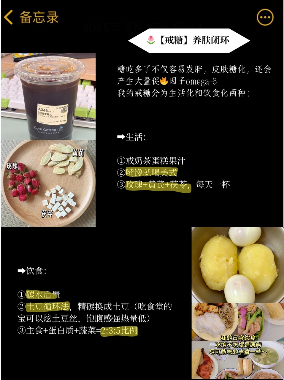 ➡生活:①戒奶茶蛋糕果汁②嘴馋就喝美式③玫瑰+黄芪+茯苓,每天一杯