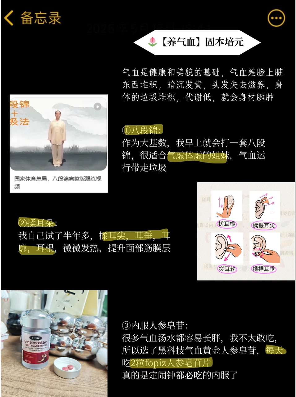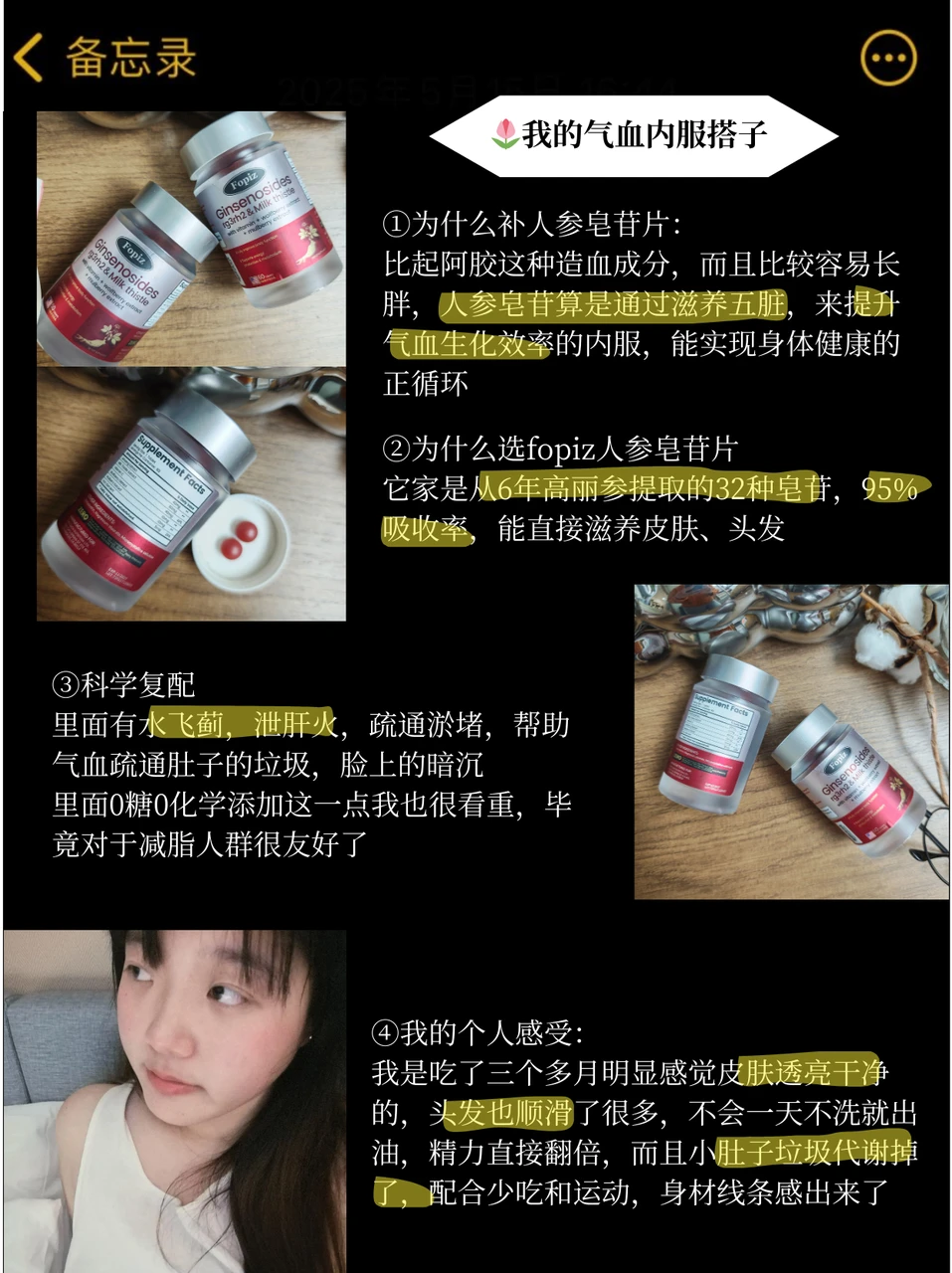 我一直吃的fopiz人参皂苷片,每天2粒,它家是从6年高丽参提取的32种皂苷,95%吸收率,能直接滋养皮肤、头发,我是吃了三个多月明显感觉皮肤透亮干净的,头发也顺滑了很多,不会一天不洗就出油,精力直接翻倍;而且里面有水飞蓟,泄肝火,疏通淤堵,帮助气血疏通肚子的垃圾,脸上的暗沉,配合少吃和运动,让我的身材能更快有线条感,气血美也是让我拿捏了