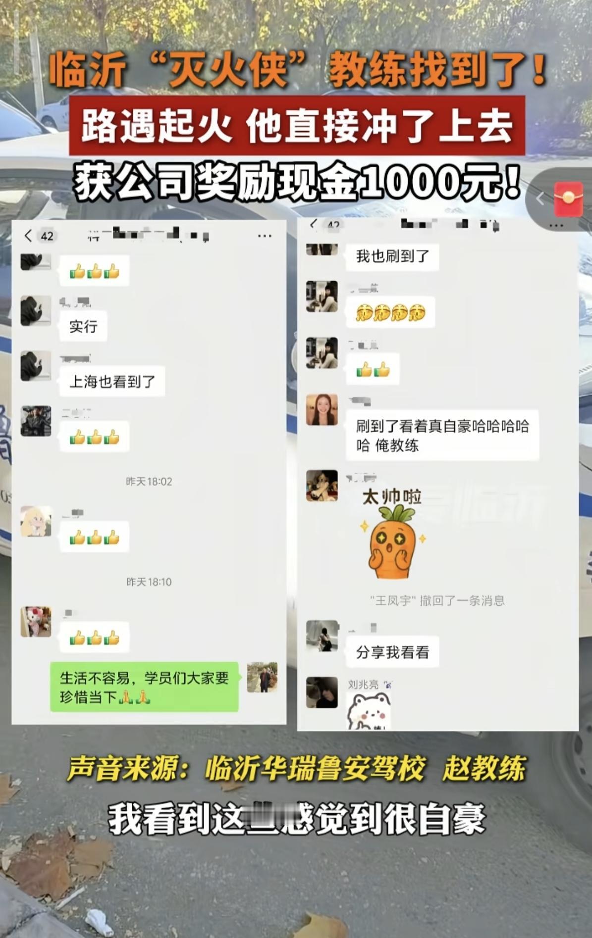 山东临沂,一煎饼摊突然起火,大娘手忙脚乱,正准备拿水往煤气罐上泼,后面冲出一个男人大喊:“等等,不要用水!”只见男人眼疾手快,不到一分钟就把火势压下去。 男子是一名驾校教练,这天他正在路旁教学员练习灯光模拟,准备接下来的上路考试。 学员错了好几次,心里很紧张,教练耐心的说:“没事,多练几次,脑子就记住了。” 都说驾校教练个个脾气都不好,动不动就对人破口大骂,但赵教练却是个另类。 他不但不骂人,还比别人有耐心,所以不少老学员都推荐到他这里练习。 正练着,学员突然推了推教练:“那里好像着火了!” 顺着目光往外看,一大娘的煎饼摊着火了,一开始是小火苗,大娘赶紧放下正在摊的煎饼,顺势去关火。 还没来得及,火苗突然窜上来,一下烧到三轮车的棚子上,整个棚子瞬间被熏黑。 大娘慌了,手忙脚乱的拿起一瓶水就往火上浇,赵教练大喊:“等等,不要用水!” 只见赵教练抄起后备箱的灭火器,一个健步冲上去,对着煤气罐猛喷,然后潇洒转身离开。 两秒钟后,火苗又燃起来,教练又回去猛喷几下,这才彻底熄灭。 整个过程不到一分钟,大娘还没回过神,教练已经回到了车里继续教学生。 不少网友被教练熟练的操作秀到了,纷纷表示太帅了,真是有胆量有方法! 回到驾校后赵教练才觉得后怕,那可是煤气罐,可不是闹着玩,稍有不慎就爆炸了。 但他又觉得很踏实和安心,避免了一场意外,大娘也避免了不少损失。 有网友说,在大娘最无助的时候,别人都不敢靠近,只有他挺身而出,真勇敢! 有的说,看哭了,不敢想要是摊子被烧了,大娘得多绝望,还好他出现了! 还有的问为啥教练的动作这么熟练? 原来是驾校经常组织灭火演戏,赵教练每次都很认真,没想到竟然在这里用上了。 后来驾校奖励赵教练一千元,表扬他挺身而出帮助别人。 不少学员也纷纷发来消息,给这位负责的教练竖起大拇指。 教练嘴角上扬:“没多大事,伸手帮忙嘛,人家也不容易。” 教学员时耐心负责,学校演练时从不应付,每一次都认真对待,正因如此,才能在遇到事时临危不乱,果断出手,为他点赞!