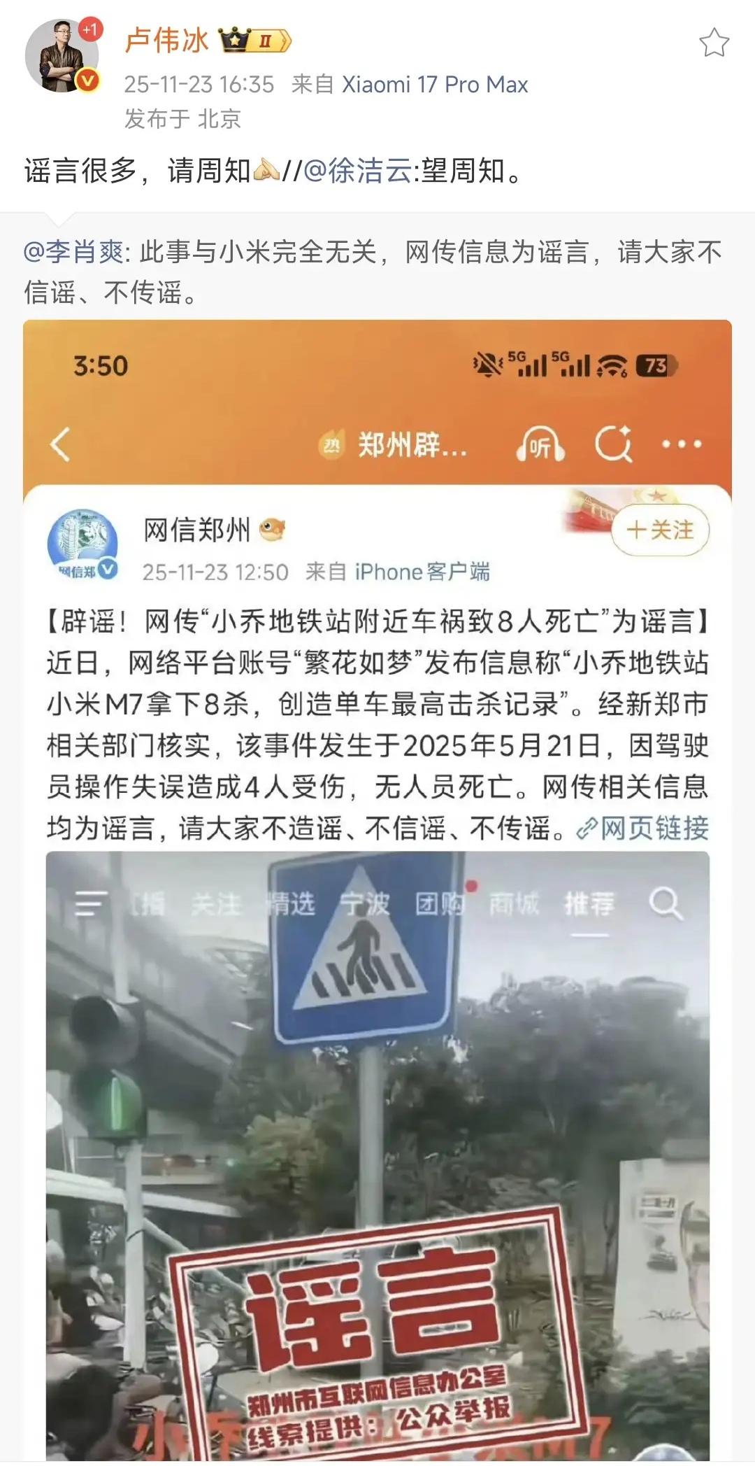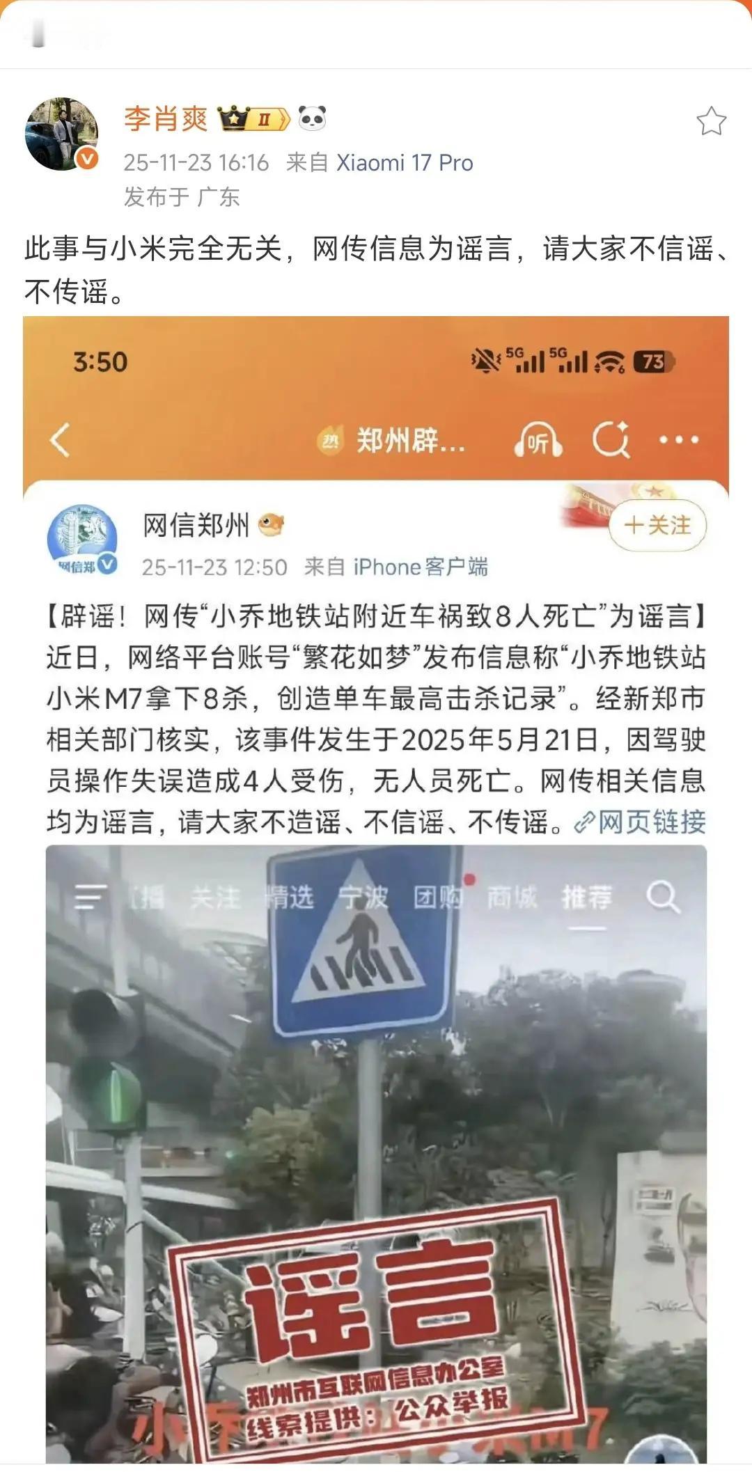 网信这篇辟谣内容,引用了一句“小米m7拿下8杀,创造最高纪录”小米3个高管转发辟谣,不是小米这是干嘛呢?就好像在说“我们被黑惨了一样” 换个说法说,小米m7这是你们根本没有的,米粉,车主,网友他们能不知道?还有图片上的描述“郑州小乔地铁站的事,失控死了好几个,界车发不出去,只能带米,有流量, 注册的新号,只是看看某米是不是网上说的那….” 这个你们都不审核的嘛,这种都需要3个高管辟谣,那以后估计会忙不过来的。 一个“提前付尾款”的官司判了,一个“涉嫌虚假宣传”的还没有判,这种不回应?是不看不见嘛,搞不懂小米这是什么策略。(刚刚又刷到一个yu7主,主驾门关不上)