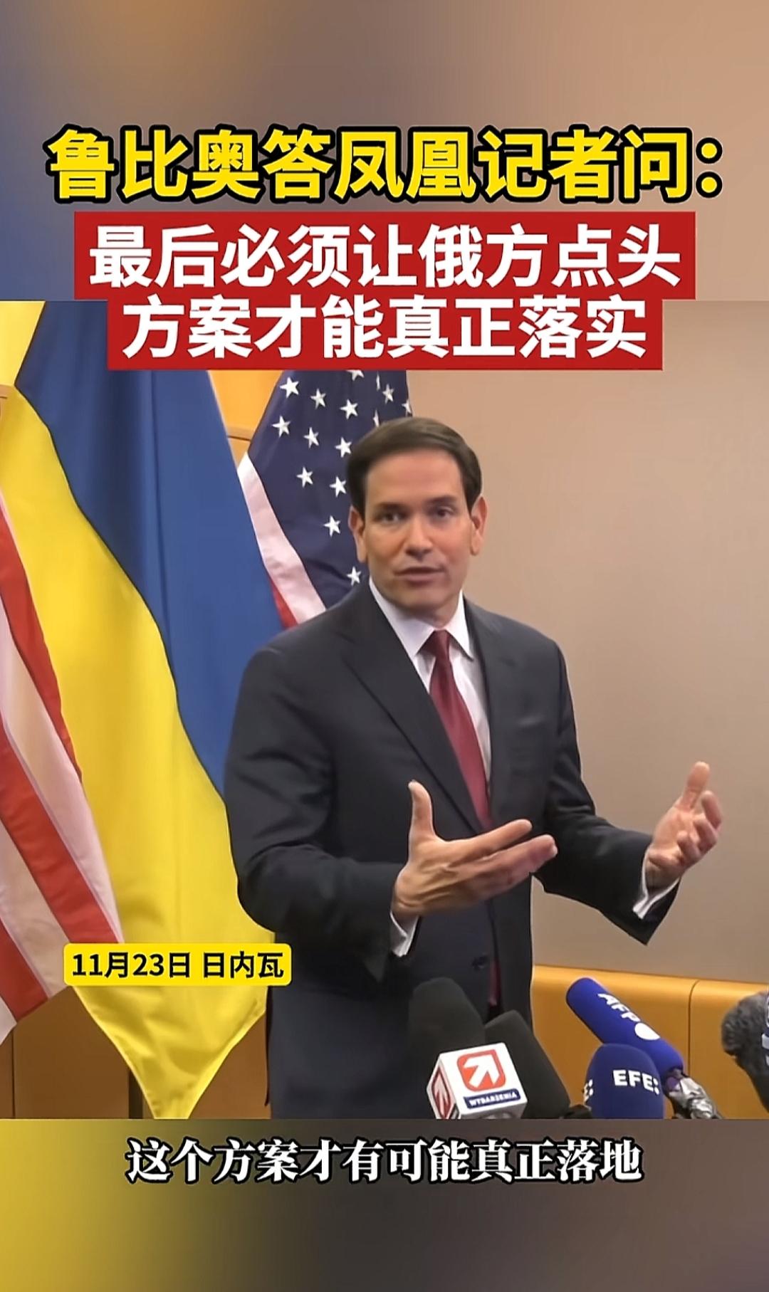 美国后退:美国没有自己的主张,你们两边同意了就行。任何一方不同意,那和平协议就不会产生;两边都接受,能谈拢,才会有和平协议。 美国不会逼迫任何一方。既然卢比奥带队到瑞士与乌方代表团坐下来谈,那就是不会逼迫乌克兰接受28条,28条不是最后通牒;凤凰记者关心地问,那你美国和乌欧商量出来的条件,俄罗斯能同意吗?卢比奥回答,无论我们这边商量出什么结果,都会送到莫斯科,只有俄方也同意了方案,才能真正落实。也就是美国也不会逼迫俄罗斯接受美乌修订的和平协议。 美国突然谦虚起来,表示自己就是个传话的,在中间跑腿的。
