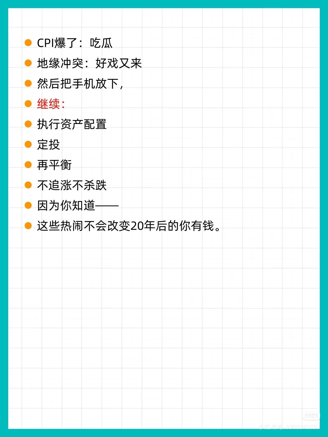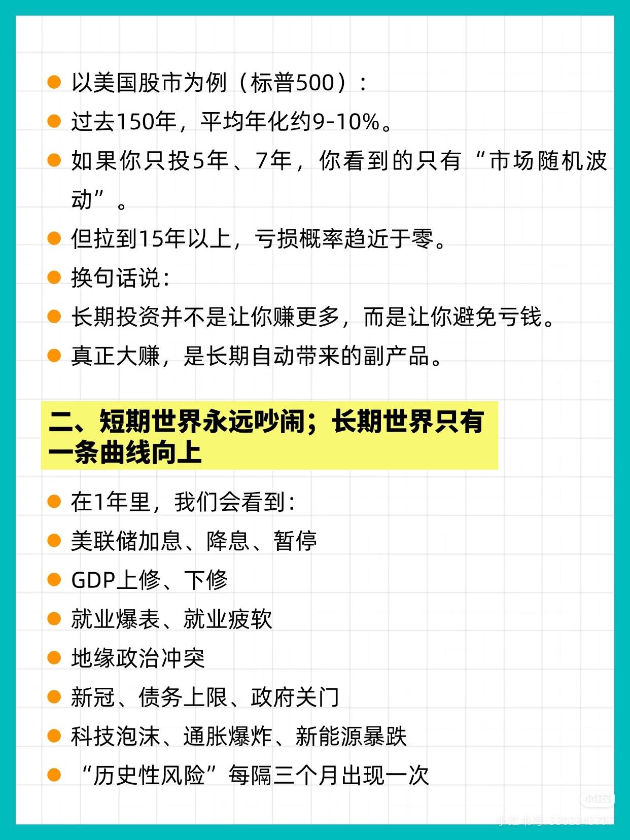 长期投资者的格局:用15年穿越噪音,让复利成为财富增长的底色 1. 财富增长的真相是指数级的,但需要时间发酵前10年看似平淡,第15年迎来爆发,第20年实现几何式倍增。大多数人投资失败,不是因为市场复杂,而是在充满噪音与短期波动的世界里,难以保持15年以上的耐心与冷静——这才是最难的事,也是超越90%投资者的关键。 2. 短期波动是常态,长期趋势才是方向以标普500为例,过去150年年化收益约9%-10%。但若只投资5-7年,你看到的是美联储加息降息、地缘冲突、疫情、行业泡沫等“历史性风险”(每季度都有)。而拉长至15年以上,亏损概率趋近于零,盈利成为必然的副产品。 3. 长期投资的核心不是预测,而是筛选与坚守不预测明天市场涨跌、不纠结非农、CPI、银行倒闭、战争等突发事件。聪明投资者只关注那些稳定、可预期的长期规律,比如全球经济持续增长、科技进步、企业盈利与复利效应。他们把新闻当《今日头条》,而非《投资指南》。 4. 屏蔽噪音,关注“气候”而非“天气”短期经济指标(如非农、CPI)就像天气难以预测,而长期趋势如同气候——缓慢、稳定、可预期。长期投资者不追短期热点,不因市场情绪频繁操作,而是坚定执行资产配置、定投、再平衡,不追涨杀跌。 5. 最高心态:看懂人性,战胜自己市场本身并不复杂,复杂的是人心——浮躁、贪婪与恐惧让人追涨杀跌、频繁操作。长期投资者的优势,不是智商更高,而是情绪更稳,能忽略噪音、抵抗诱惑,用15年时间让财富和人生都回归简单。 🌟 总结金句(来自第7张图): “短期是噪音,长期是信仰;新闻是热闹,复利是底气。” 如用一句话概括: 长期投资,就是用耐心穿越市场的喧嚣,在时间复利的加持下,让财富自然成长,让投资回归理性与简单。