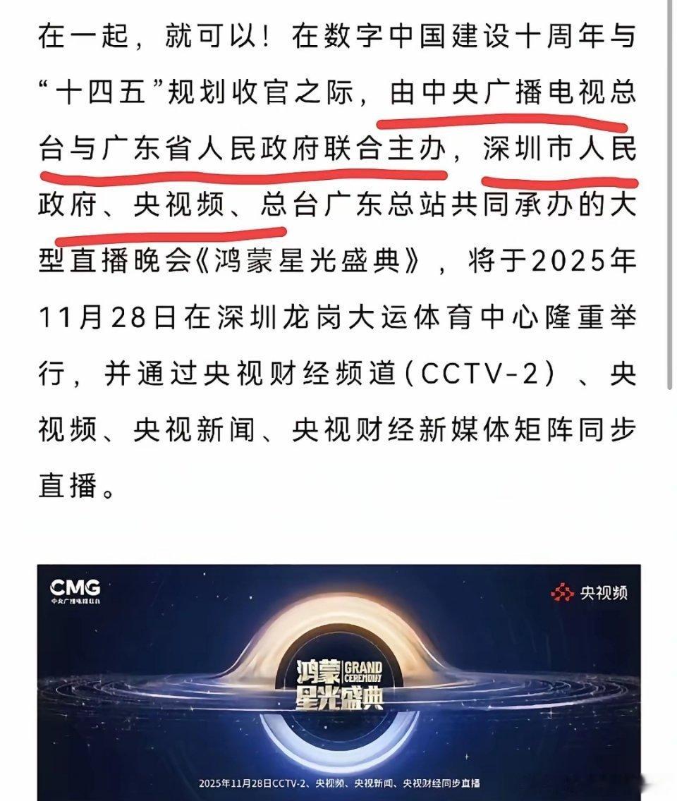 鸿蒙星光盛典的主办方是央视广播总台+广东省人民政府;承办方是深圳市人民政府+央视频+总台广东总站……
