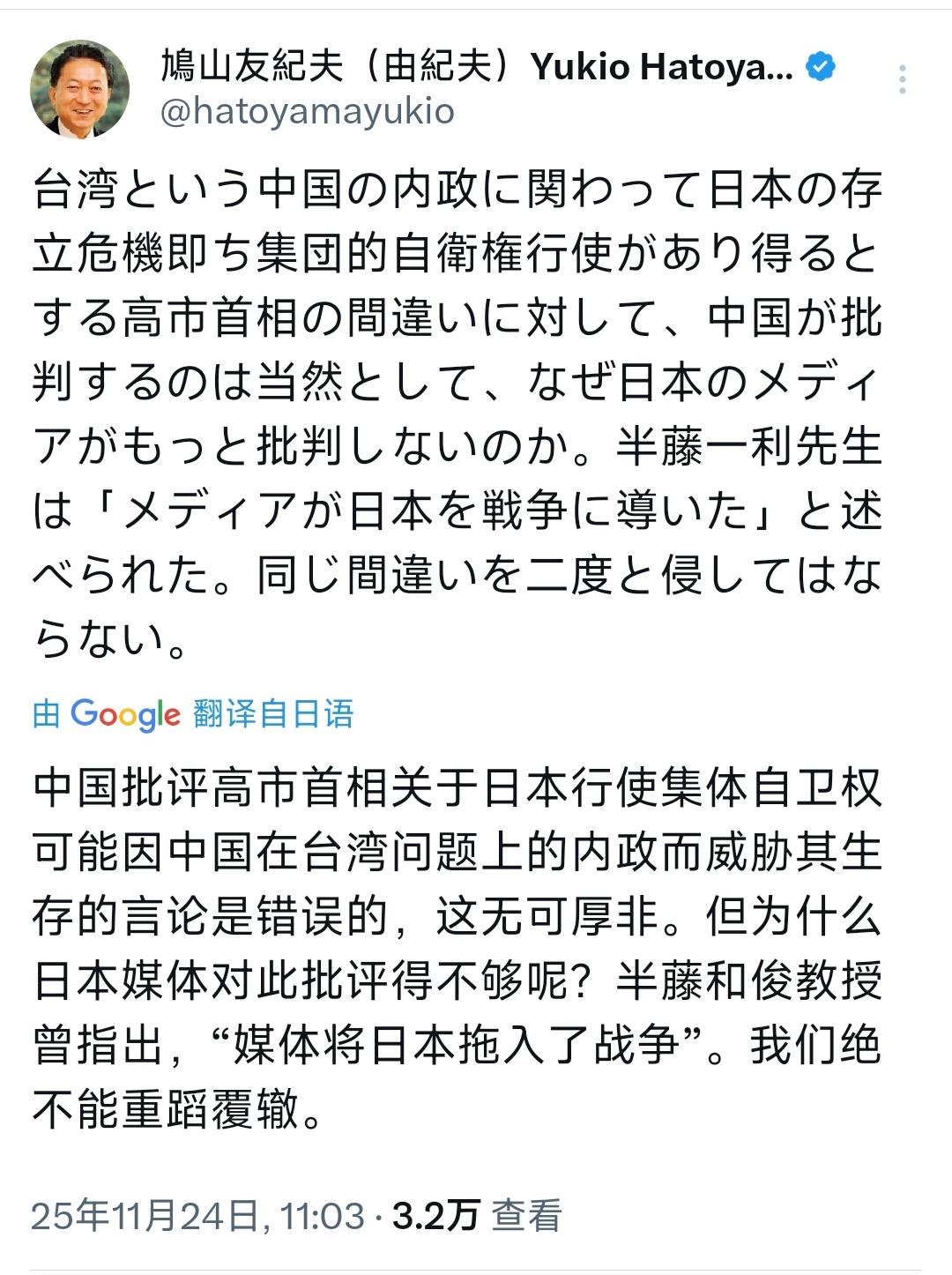 日本政坛这是要炸翻天了!前首相鸠山由纪夫今天公开炮轰现任首相高市早苗,顺带把整个日本媒体圈都给骂了一遍!这操作,简直让人大跌眼镜,完全是在自家后院点火。   就在今天(2025年11月24日),日本前首相鸠山由纪夫在他的社交媒体上写下了一段极具分量的话:   “对于高市首相所谓涉足台湾这一中国内政就可能引发日本存亡危机、即有可能行使集体自卫权的错误观点,中国进行批判理所当然,可为何日本媒体却不更多地加以批判呢?半藤一利先生曾说过‘是媒体将日本引向了战争’。绝不能再重蹈同样的错误。”   这事儿得从半个多月前说起。11月7日,日本现任首相高市早苗,在国会接受质询时扔出了一颗重磅炸弹。   她声称,如果台湾海峡发生战事,将可能构成“日本存亡危机事态”。   这话可不是随便说说。这等于是公开暗示,一旦台海有事,日本就可能行使所谓的“集体自卫权”,直接军事介入。   这是日本历史上,第一次有在任首相把“对台出兵”的可能性说得如此直白。   高市早苗的法律依据,是安倍晋三政府在2015年修改过的《武力攻击事态法》。   这部法律为日本在没有直接受到攻击的情况下,以“盟友遭难”为由出兵海外打开了一个口子。   高市这番话,不光惹恼了邻国,自己家里也炸了锅。   中国外交部和国防部接连发出严厉警告,明确表示如果日方胆敢武力介入台海,必将“碰得头破血流”。   紧接着,中方一系列反制措施迅速到位。部分中日高层外交活动被暂停,一些重要的经贸洽谈也被搁置。   最直接的冲击体现在旅游业上,中国赴日游客数量断崖式下跌。   最有意思的是高市本人。这位首相在捅了马蜂窝后,居然沉默了整整14天,直到11月22日去参加G20峰会前,才不痛不痒地表态说“对台立场不变”,连一句道歉或者收回言论的意思都没有。   这心理素质,也不知道是好还是坏(大概是脸皮比较厚)。   日本国内也不是铁板一块。超过1200名日本民众直接跑到首相府门口抗议,要求高市收回她的战争言论。   日本的渔业和农业团体更是叫苦不迭,比如扇贝等海产品对华出口直接被卡住了。   所以,鸠山由纪夫今天的发声,可以说是点燃了早已积压的干柴。   他最狠的地方,还不是骂高市,而是把矛头直指整个日本媒体。   他引用了日本著名历史学家半藤一利先生的一句警世名言:“是媒体将日本引向了战争。”   鸠山警告说,绝对不能再重蹈覆辙。他这句话,戳到了日本社会的痛处。因为现在日本的舆论环境,确实让人感到一丝寒意。   像《产经新闻》这类右翼媒体,常年累月地渲染“中国威胁论”。   这些媒体在高市发表危险言论后,非但没有进行深刻的批判和反思,反而还在帮着煽风点火,试图将日本民众的注意力从国内低迷的经济上转移开。   这种操作,和二战前何其相似。   更可怕的是,日本敢于说真话的媒体越来越少。   自从1987年《朝日新闻》的记者因为批判历史问题而遭到右翼分子袭击遇害后,再加上安倍时期出台的《特定秘密保护法》,日本媒体的自我审查已经到了非常严重的地步。   站出来反对的,也不止鸠山一个人。前首相野田佳彦批评高市的言论“极为轻率”,会损害日本的国家利益。   另一位前首相石破茂也警告说,“台湾有事即日本有事”是历届政府都不敢轻易触碰的红线。   说白了,高市这波操作就是一场政治豪赌。   她想通过在台湾问题上表现出史无前例的强硬,来讨好国内的右翼势力,巩固自己的政治基本盘,同时也是向美国“表忠心”。   但尴尬的是,大洋彼岸似乎并不领情。   美国总统特朗普最近正忙着抱怨“盟友们在贸易上占了美国太多便宜”,对高市的言论并未给予任何公开支持,美日同盟的裂痕若隐若现。   高市的算盘,显然是打错了。她可能以为,只要抱紧美国的大腿,就能在台海问题上为所欲为,顺便还能突破和平宪法的束缚。   但她严重低估了中国的反制决心和日本经济对中国的依赖程度。   中国这边也没闲着,一套组合拳打得日本很难受。   就在11月中旬,中方在联合国重提“冲绳(琉球)原住民权益”问题,直接戳到了日本在领土问题上的敏感神经,让日本政府暴跳如雷。   现在,高市早苗在国际上基本处于被孤立的状态。   在刚刚结束的G20峰会上,没有任何一个主要国家公开支持她的冒险言论。   就连自民党内部,防卫大臣小泉进次郎也与她保持距离,警告她“不要轻易暴露底牌”。   鸠山由纪夫作为日本政坛的“良心”,他的呐喊虽然尖锐,却也道出了一个残酷的现实:   一个不敢正视历史、被右翼势力和短视政客绑架的国家,正在一步步滑向危险的深渊。   至于日本媒体能否悬崖勒马,目前看来,希望不大。