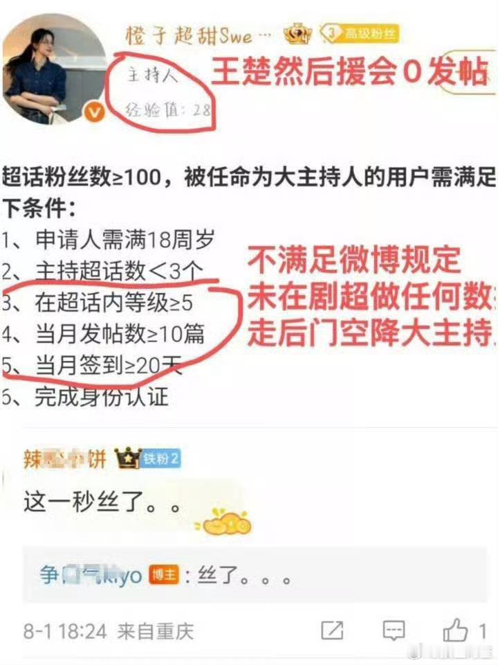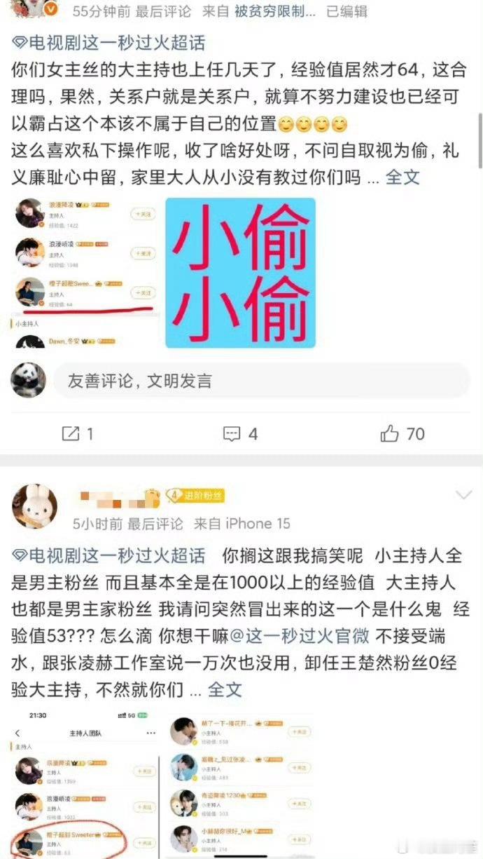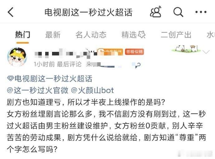 《这一秒过火》超话之前都是张凌赫粉丝在经营管理,前几天空降了一个女主王楚然粉丝当大主持,男主粉丝质疑中,要求剧方给一个合理的解释。这个事情,其实剧快播出了,剧方想让男女主双方分手都有大主持人很合理,但是至少应该提前通知一直辛苦付出的男主家,并且人选也应该是能好好管理超话的人选……这样突然空降确实是有点不尊重了。