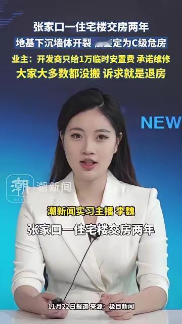 张家口那个交房才两年的住宅楼,地基下沉、墙体开裂,直接被鉴定成了C级危房。 业主们提心吊胆住着,开发商就扔了1万块钱临时安置费,还说会维修。可到现在也没动静,业主们连个安稳觉都睡不了。 谁的钱是大风刮来的?花了大半辈子积蓄买的房,结果成了“定时炸弹”,这换谁不愤怒? 开发商轻飘飘一句“承诺维修”,就想把事儿糊弄过去?凭什么让业主们用血汗钱为你们的劣质工程买单? 希望相关部门能管管,别让业主们的权益被当皮球踢。