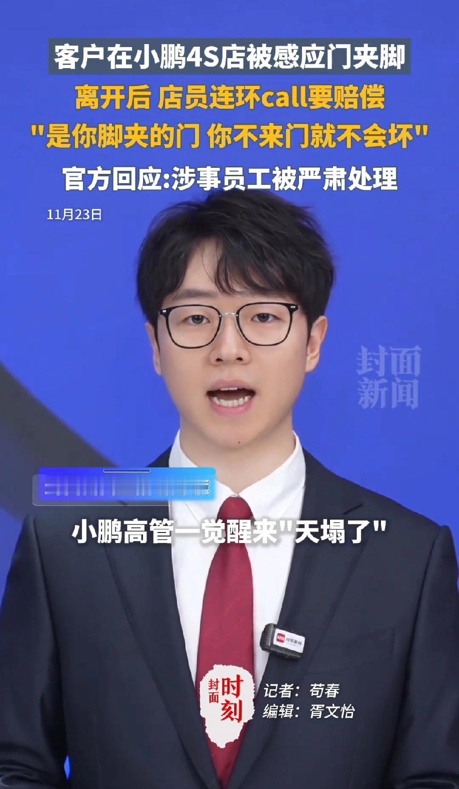 海南海口,一位大哥满心欢喜去看车,结果刚到门店就被被感应门夹了脚,虽然脚有点痛,但大哥也没多说什么,然而,还没等他缓过劲来,门居然脱轨损坏了。更离谱的是,他刚离开不到十分钟,就接到门店打来的连环电话,一张口就是让他赔偿门的损失,丝毫不关心他有没有被门夹伤。甚至理直气壮的说:“是你的脚夹到门,你不来门就不会坏”。 (来源:封面新闻) 11月15号晚上,海南海口的一位大哥满心欢喜去小鹏4S店看车,想着能试驾体验下心仪的车型,没成想车没摸着,先被店里的电动感应门“坑”了一把。 当时导购领着大哥往门口走,说要带他去看试驾车,结果刚走到感应门跟前,导购突然说试驾车被人开走了。 大哥愣了一下,转身就想回店里再聊聊,脚刚抬起来准备迈步,那扇感应门“哐当”一下就自动合拢了,结结实实夹在了他的脚上。 更意外的是,这门不仅没像正常感应门那样回弹,反而直接脱轨了,玻璃边缘还磕破了一块。 大哥疼得皱了皱眉,但也没跟店里争执,觉得可能就是个意外,还跟导购加了微信,约定下次试驾车回来了再过来。 可他刚离开4S店不到十分钟,手机就开始响个不停,短短一会儿就接到了五六个电话,让他回去协商赔偿门的损失。 大哥一头雾水地接了电话,结果导购的话更让他懵了。录音里导购一口咬定:“门是你没走出去又拐进来,你的脚夹到门了”。 大哥反驳说明明是门夹自己的脚,怎么反过来怪他,没想到导购抛出了更离谱的逻辑:“如果你没有来我们店,那这个门也不会坏”,还指责大哥“连句抱歉都没说,态度有问题”。 这事儿被大哥发到网上后,网友们都看傻了,纷纷吐槽这是“年度最离谱沟通”。 后来小鹏官方回应了,说涉事员工在接待和沟通上有明显过错,已经做了顶格处理,还处罚了门店店长,承诺会加强全国门店的培训管理。 其实这事儿说穿了就是服务意识的缺失。顾客在店里被门夹了,店家第一反应不是关心人家脚有没有事,反而想着让顾客赔门,这完全搞反了责任。 4S店作为经营场所,本就该保障顾客的安全,感应门没起到防夹作用还损坏,本身就是设施问题。 “你不来门就不会坏”这种逻辑,简直是强盗思维。服务行业拼的就是口碑,一次糟糕的体验可能就会失去一个客户。 小鹏及时处理涉事员工是态度,但更该好好整改服务流程,让员工明白,顾客进门是来消费的,不是来背锅的。