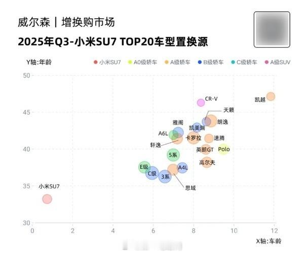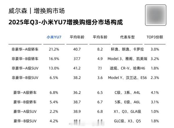 三季度小米汽车增换购数据来了,看看车主们都从哪来?根据机构公布的数据报告小米YU7在本季度的增换购比例高达63.8%,相当于每卖出三台YU7,就有接近两台是用户换购而来的。品牌来源:大众是“主力军”大众是同时流向小米SU7和YU7最多的品牌,稳居第一其他主要来源品牌包括丰田、宝马、本田、奔驰等传统合资与豪华品牌,显示小米对德系和日系车主的吸引力很强YU7还成功从特斯拉、理想、小鹏等新势力品牌中争取到了用户用户画像:谁在换购小米?SU7车主:多为40岁以上、旧车开了8年以上的“被动升级”群体,更关注续航和保养成本YU7车主:更年轻,平均年龄约37-38岁,旧车车龄仅3-6年,属于“主动升级”群体,更愿意尝试智能配置(如激光雷达)
