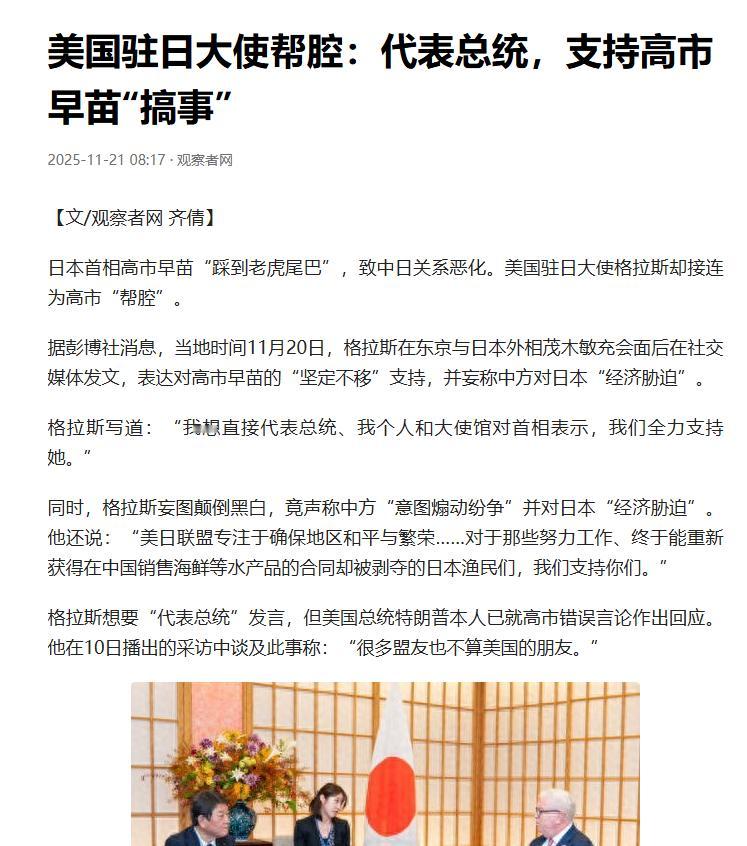 还是被我猜中了 高市早苗一开口,东亚这口锅就开始冒烟。一句“台湾有事就是日本有事”,不仅让日本国内右派欢呼,也迅速点燃了区域神经。 话音刚落没几天,美国那边就递过来了“话筒”,国务院发言人立马站队,钓鱼岛、台海、同盟,全都摆上了桌面。 这场配合,实在太默契。高市挑头,美国跟进,节奏像是排练好的。格拉斯作为美国驻日大使,更是直接在社交媒体上表示要代表特朗普全力支持高市早苗。 日本这些年对台湾议题的“热情”并非一时冲动。高市早苗的立场,其实早已不是秘密。 她多次明示,“台海稳定关系日本安全”。但这次的高调发言,明显带着试探意味。 试什么?看中国的反应强不强,看国际社会有没有回音,同时也让美国有台阶接话。 美国的回应相当及时,但更值得琢磨的是背后的节奏变了。特朗普政府上台后,面对国内经济和政治压力,外交策略明显“轻装上阵”。不再大张旗鼓地对抗中国,而是把“代理人”推到了前台,自己退居幕后当“导演”。 高市早苗这种级别的政治人物,若没有背后撑腰,不可能轻易喊出如此敏感的言论。 她的这番话,既是对中国底线的试探,也是日本内部右翼势力的一次“加温”。但更重要的是,这种行为在当前美日关系背景下,变成了一种“战略演出”。 美国站台,不是因为高市说得多对,而是因为她说出了美国想说但不方便直接说的话。 这种“借口发声”的方式,是近年来美国在亚太频繁使用的策略。既能撬动舆论,也能牵制中国,同时还能维持“和平倡导者”形象。 与此同时,新加坡总理黄循财在接受采访时的一番话,也让人感觉“风向有变”。他呼吁中国“效仿东南亚与日本搁置历史”,并称日本是“最受信任的大国”。 这话听起来像是在劝和,实则是在模糊历史责任,把矛头悄悄对准了中国的“态度”。 新加坡的这种表态并非偶然。数据表明,日本这几年在东南亚的投资远超中美,占到外资总额的28%。 面对经济利益,一些国家开始在安全话题上左右摇摆。这种“经济合作”与“战略依附”的混搭,正在慢慢改变区域角力的天平。 日本想借台湾这个话题重新站上地区舞台,而美国更需要一个“亚洲代理人”来稳定局势。两者一拍即合。 但问题在于,这种做法很容易引发误判。高市早苗的言论不是一句空话,而是实打实在挑战一个中国原则。 如果这类表态不被遏制,未来会有更多类似的声音涌现。久而久之,台湾问题就会被“国际化”、“多边化”,从而失去中国主导局势的话语权。 从中国的角度来看,该出手时必须出手。高市言论不回应,就会被视为默认。 而在经济层面,中国对日本的贸易依存度仍占其外贸总额的24%。这本身就是一张牌,可进可退。 通过适度的经济杠杆,既能表达立场,也能形成实质性压力,比空喊口号更有效。 美国现在扶持日本的做法,实则是希望借助区域盟友来打“一场不属于自己的仗”。而新加坡的表态,则像是在告诉大家:别太认真,经济最重要。 这种态度看似聪明,但实际上很危险。小国在大国博弈中站队,若没有清晰的战略定力,容易被裹挟进更深的冲突。 新加坡若继续在历史问题上“劝中国克制”,却对挑衅行为视而不见,无疑是在为区域不稳定添油加火。 在当前的格局下,中国要做的不是回避冲突,而是掌握节奏。斗而不破,是原则;该回应就回应,是策略。 通过经济、外交、舆论多维发力,不让对方轻易得分,也不给“代理人”试探的空间。 亚太的稳定,不可能靠一个个“代理人”维系,更不能靠美日暗中合演的剧本来决定。 中国要在这场博弈中,找到属于自己的主动权。与其被动应对,不如借机布局,强化区域合作机制,把美日的“圈地行为”反制成中国的“拓展空间”。 台海问题不该成为某些国家刷存在感的工具。区域安全,也不该由几个“话语大户”说了算。 局势复杂,并不代表没有主线。高市早苗事件表面看是个言论风波,实则是一场战略测试。谁在表演,谁在下注,谁在看牌,谁在布局,一目了然。 信源:美国驻日大使帮腔:代表总统,支持高市早苗“搞事”——2025-11-21 08:17·观察者网