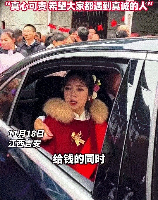 江西一新郎接到新娘后,新娘奶奶跑过来,紧拉着新娘的手,塞红包嘱咐好好过日子,新娘泣不成声。