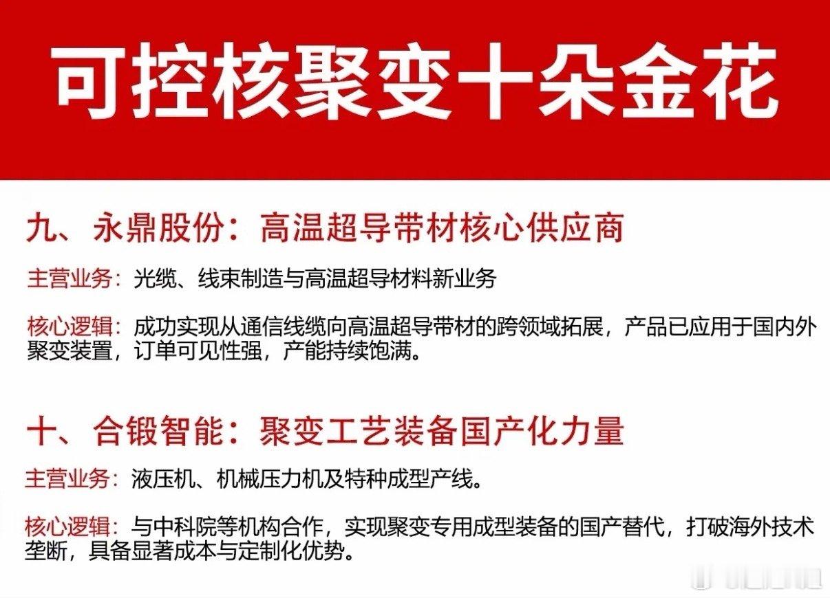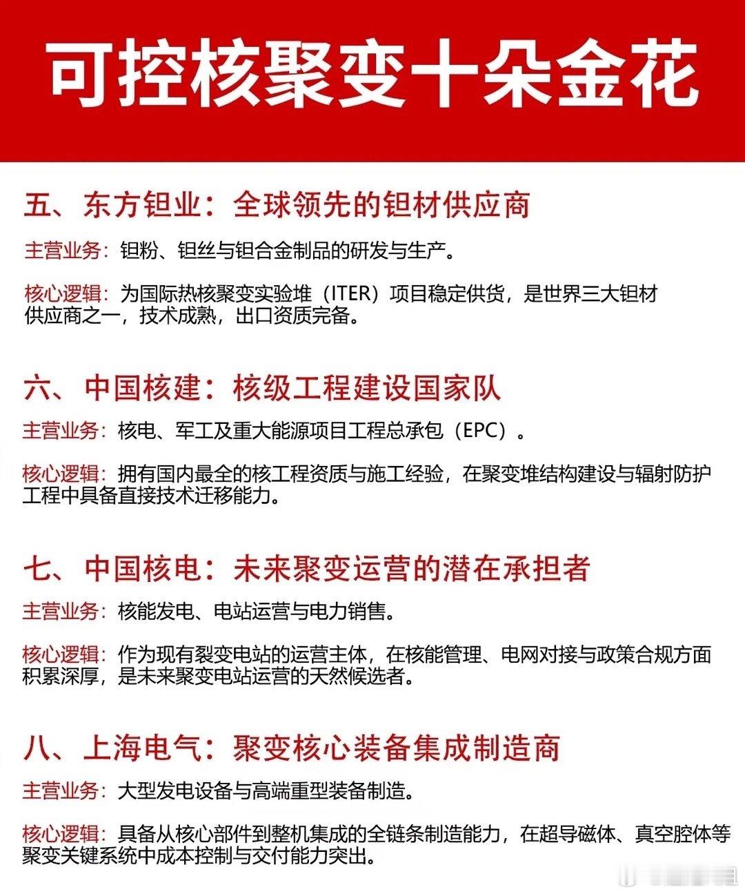 谁懂啊!中国可控核聚变产业链已经悄悄集齐“十大神队友”,从材料到建设全拿捏,这波硬实力直接拉满!🔥皖能电力:用稳赚的火电现金流“养”核聚变,传统能源反哺前沿科技,这操作够稳健!⚙️安泰科技:托卡马克装置“卡脖子”材料攥在手里,高端金属技术壁垒直接焊死!🌏厦门钨业:从钨矿到高温部件全产业链打通,成本和供应稳如泰山!🎯国泰集团:子公司手握稀缺聚变靶材,冷门小金属偏成“香饽饽”,议价权拉满!🌐东方钽业:给国际ITER项目供货的全球钽材大佬,技术+出口资质双buff叠满!🏗️中国核建:核工程“国家队”出马,核电建设经验直接平移聚变堆,资质全经验足!🔌中国核电:裂变电站运营老大哥,未来聚变电站运营的“天选候选人”,政策电网门儿清!🏭上海电气:超导磁体、真空腔体说造就造,整机集成+成本控制,交付效率绝了!⚡永鼎股份:从光缆跨界高温超导,带材订单接到手软,国内外聚变装置都在用!🛠️合锻智能:联手中科院打破海外垄断,聚变成型装备国产替代,定制化还便宜!十家企业从材料到装备、从建设到运营,把可控核聚变产业链的关键环节全吃透!这哪是企业布局,分明是中国未来能源的“王炸阵容”!