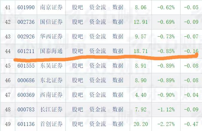 什么情况?十家头部券商股今天有六家上涨,一家停牌,三家下跌。总的表现只能说是差强人意。 今天头部券商股涨幅拔得头筹的是华泰证券,收盘上涨1.16%,居所有券商股涨幅排行榜第七名。招商证券收盘上涨0.80%,在头部券商股涨幅属第二名,东方财富收盘涨幅0.56%,在头部券商股中属第三名。其它几只头部券商股中信证券收盘上涨0.33%,广发证券收盘上涨0.28%,中国银河收盘上涨0.06%。中金公司因重组停牌。 今天收盘下跌的三只头部券商股分别是中信建投收盘下跌0.12%,国信证券下跌0.69%,最不可思议的是国泰海通收盘下跌0.85%,在十家头部券商股中涨幅排倒数第一。让人情何以堪啊?