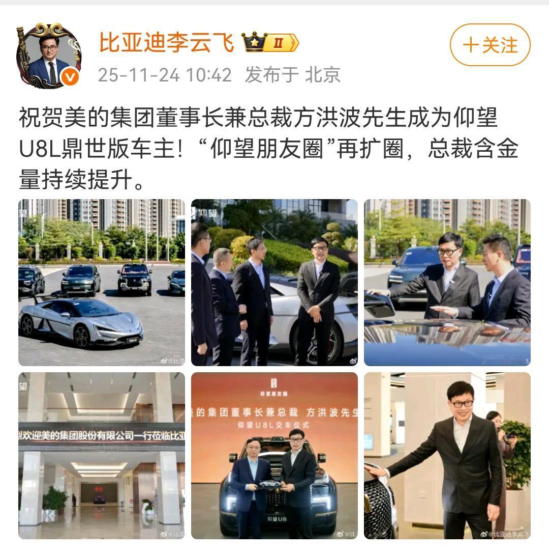 比亚迪李云飞:祝贺美的集团董事长兼总裁方洪波先生成为仰望U8L鼎世版车主!“仰望朋友圈”再扩圈,总裁含金量持续提升。 仰望U8L这款车也即将成为现象级的产品,是目前仰望系列中价格最贵的SUV产品,仰望的月销量虽然不高,但是含金量却非常的高。 特别是仰望U8的潜水功能,仰望U8L也得到了继承,独特的功能在目前的产品中是首屈一指的。 各位是怎么看的?欢迎评论区留言。