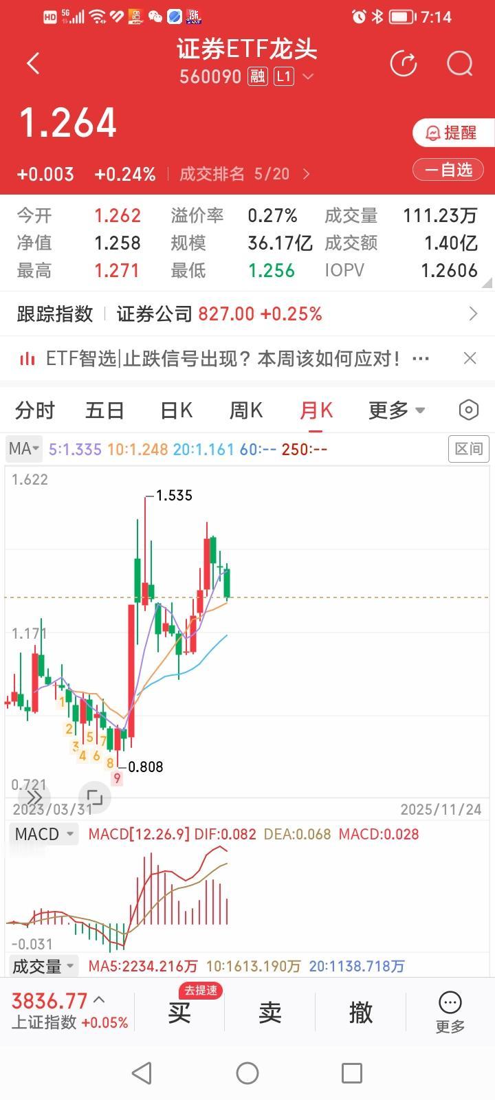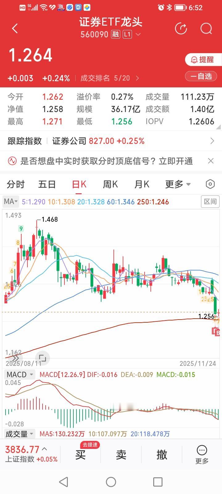 证券ETF龙头(560090)今天到底是倒车接人还是拉人头站岗啊? 证券ETF龙头这一波跌的有点狠。周末利好消息不少,本指望证券ETF龙头大不了补完缺口就会强势上涨的,没想到冲高回落倒车接人来回接了四趟。这么搞好像有点不是倒车接人而是拉人头站岗了。 今天咱一开盘就挂了个1.260元的买单买证券ETF龙头,没想到在9:33分就成交了,它最低探到了1.256元,咱又低估了市场的杀伤力。 证券ETF龙头不知不觉竟然已经月线三连阴了,而且这几天更是快速杀跌,何时见底呢?