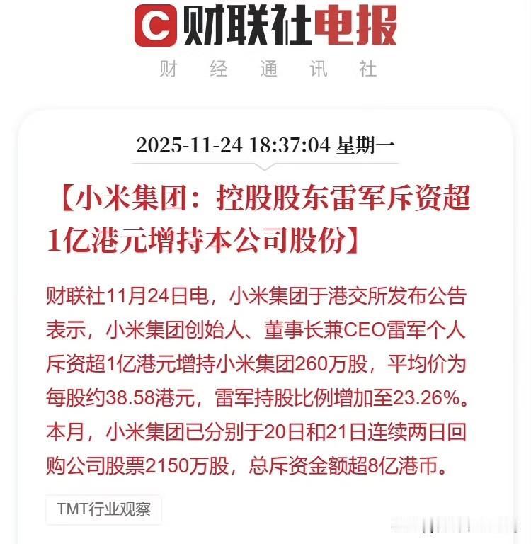 雷军雷总斥资超1亿港元增持小米集团。 本次增持后,雷军持有小米集团的股份比例增至23.26%。 看了下,相比刚好万亿市值的小米集团,1亿不算很多,但意义相当重大…… 这是信心增持啊! 之前何小鹏增持小鹏汽车,市场反馈就很不错,这次雷军也表示了一下。 下一个该谁了? 我觉着李想是不是应该也动一动?