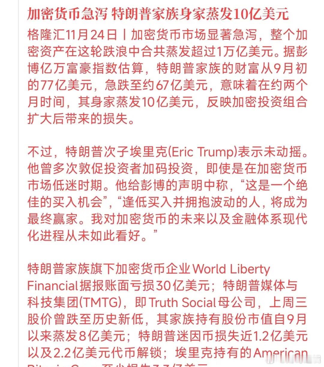 要说现在者最闹心的非特朗普莫属,仅仅两个月特朗普家族的财富就缩水了1/7这两个月由于各国都对加密货币出现质疑,导致加密货币出现暴跌,而特朗普更是加密货币的忠实粉丝,大部分的财富都买了加密货币,现在最坚挺的比特币从12.8万美元跌到了8.3万美元,更别说其他数字货币了。短短时间特朗普家族就缩水了10亿美元的财富。不过从特朗普的态度看是一点没卖,对加密货币所有绝对的信心。从历史上看,每次数字货币大跌后都会出现更大的反弹,出现更高的价格。就是不知道这次加密货币会怎么样,毕竟这次美联储是否降息将会关系加密货币的生死。