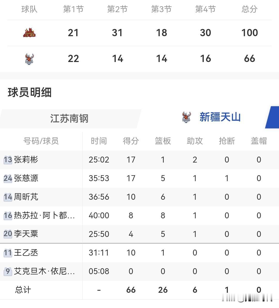 罗欣棫18+ 许晨妍18+ 王馨雨17+ 江苏女篮100-66新疆女篮