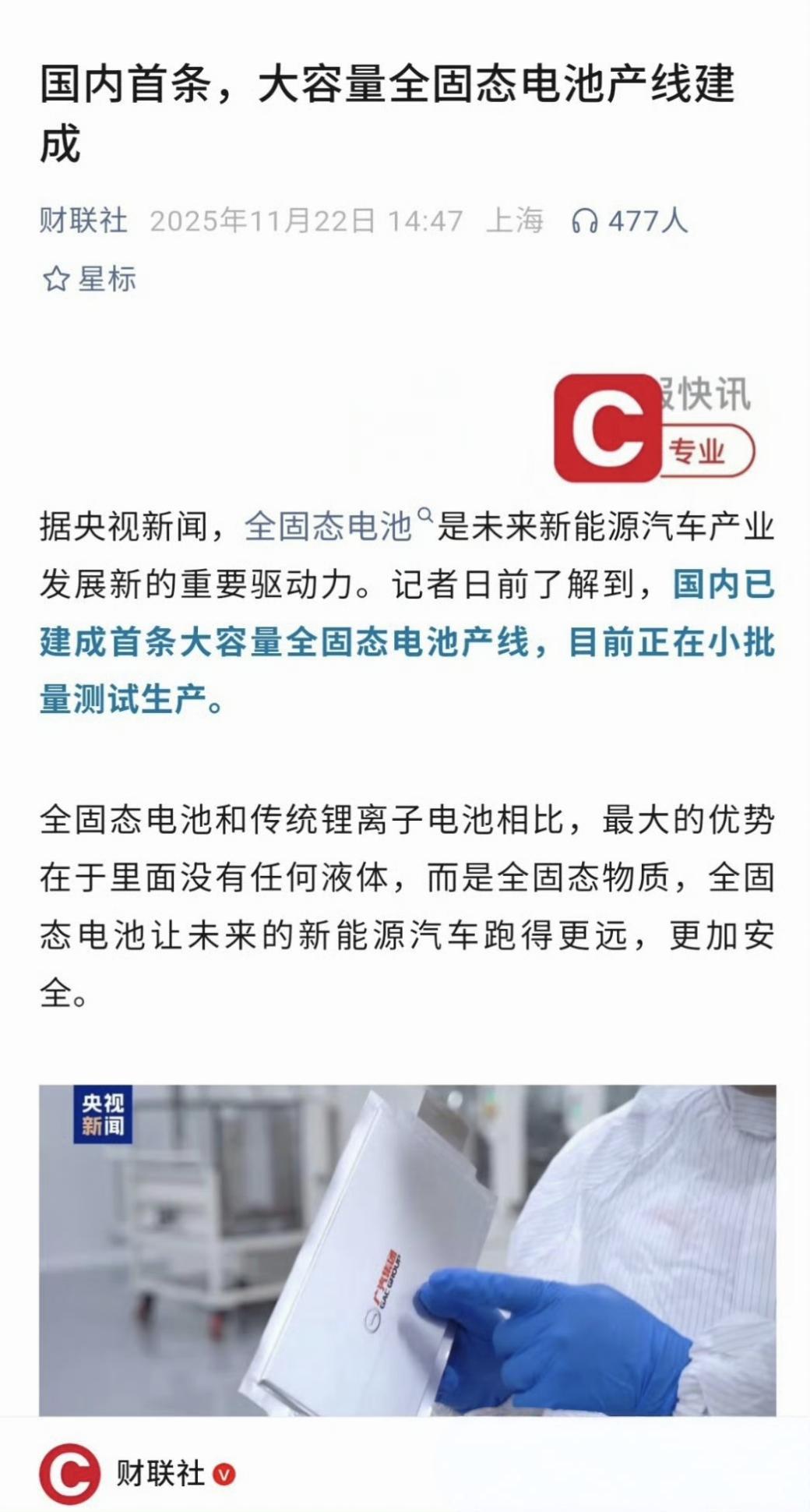 广汽宣布全固态电池生产线要量产了。 全固态电池除了安全,能量密度也比现有的电池能量密度高了接近一倍,续航也能提升一倍。 广汽计划,2026年可以进行小批量的装车实验,2027年到2030年期间,可以逐步地进行批量生产。 目前已经有MG4宣布半固态电池(95%固态)马上12月交付,全固态电池行业普遍预计量产时间是2030年左右。【来自懂车帝车友圈】