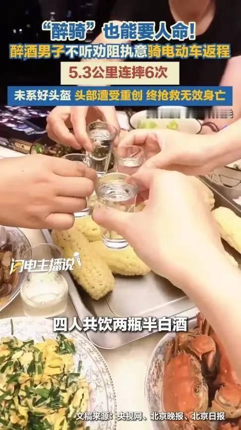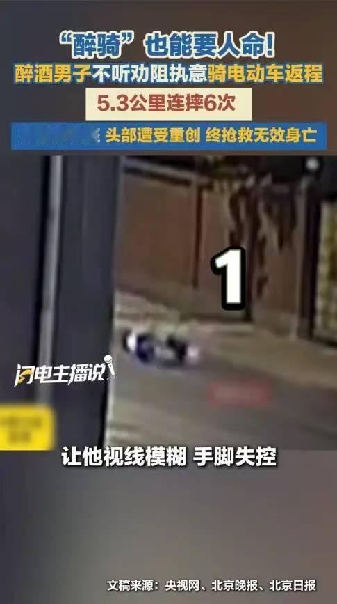“悲剧还是发生了!”11月10日,北京,一男子与朋友吃饭时,喝了大量白酒和啤酒,饭局结束后已经连路都走不稳了,可是他却执意骑车回家,结果一路上他先后摔倒6次,最终因没有系好头盔,导致头部重创死亡!网友:全是自己作的。 那晚聚餐持续了近三小时,冯某和三位同事一起喝掉了两瓶半白酒,他自己还额外点了一瓶啤酒混饮。散场时,他已经脚步虚浮,说话也不太利索了。 同事们都看出他状态极差,反复劝他别骑车,打个车安全回家。可冯某非常固执,连连摆手说“骑电动自行车没事”,觉得自己能行。甚至有同事提出送他,也被他以对方也喝了酒为由拒绝。就在几位同事商量如何安置他的短暂空隙,冯某自己跨上了电动自行车,摇摇晃晃地上了路。 酒精严重破坏了他的平衡感和判断力,在短短5.3公里的归家路上,他接连摔倒了六次。晚上11点18分,先在北苑路段失控倒地;扶起车掉头时,又撞上隔离带再次摔倒。这之后,在仰山桥下等红灯时,他连头盔和手机都拿不稳了。每一次摔倒,他都勉强爬起,抱着“再坚持一下就到家的”侥幸心理继续骑行。 11月11日零点整,在上清桥东侧,冯某的电动车撞上了路缘石,这是他第六次,也是最后一次摔倒。虽然同事给了他头盔,但致命的是,他没有系紧卡扣,摔倒瞬间头盔直接飞脱,没能起到任何保护作用。 他的头部遭受重创,最终抢救无效身亡。事后检测显示,他血液中的酒精含量高达269mg/100ml,是醉酒标准的三倍还多。很多人误以为电动自行车速度慢,喝酒骑行问题不大,但酒精会直接让骑行者平衡失调、反应迟钝,而两轮车缺乏车身保护,一旦出事,最脆弱的头部往往首当其冲。 这场悲剧最让人叹息的是,它本有多次机会可以避免。无论是起初听从劝告选择其他回家方式,还是在第一次摔倒后果断放弃骑行,结局都可能完全不同,安全底线,真的容不得半点侥幸。 各位读者你们怎么看?欢迎在评论区讨论。