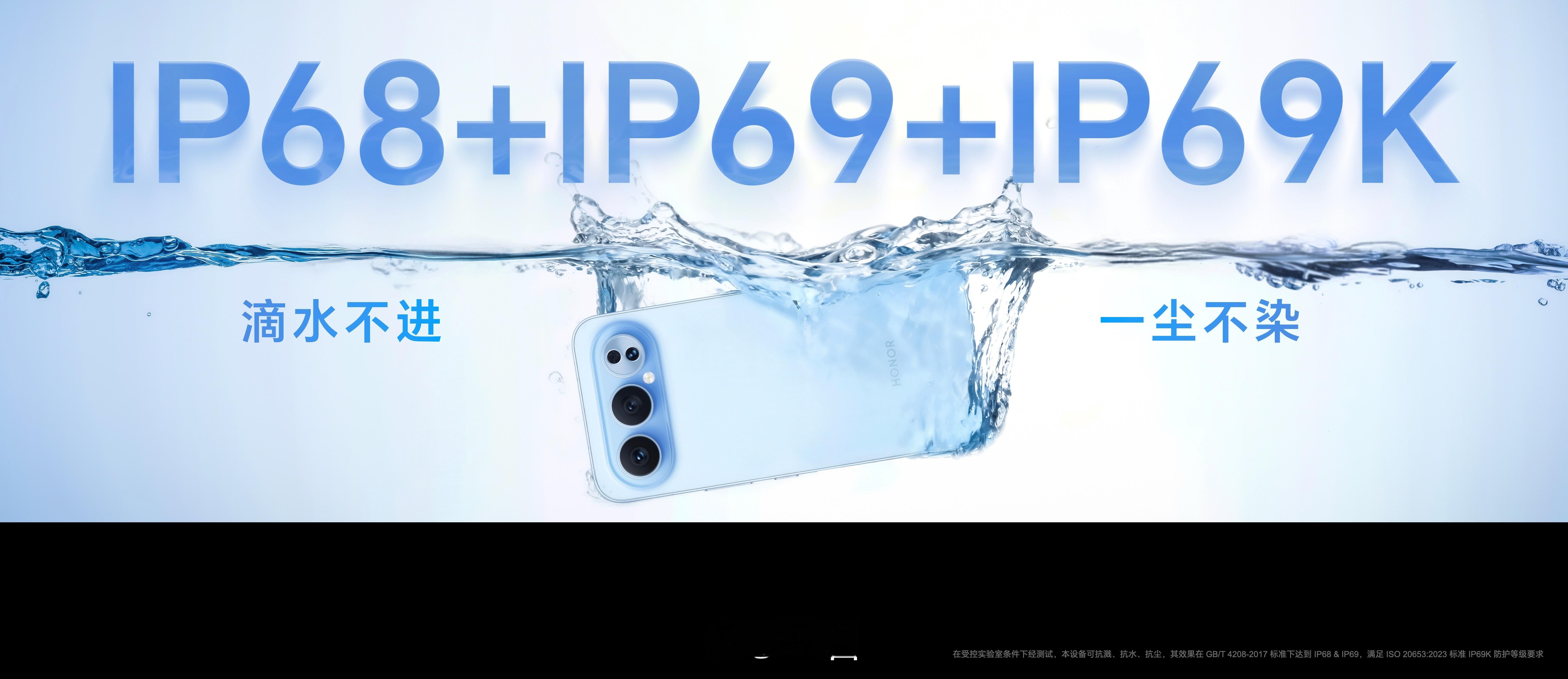 系列沉浸体验超可靠!荣耀500系列应用全新屏幕生产工艺,实现了行业最窄1.05mm黑边,提供无界沉浸的视觉享受。同时,新机还支持IP68&IP69&IP69K行业至高防水等级,滴水不进、一尘不染,带来更加安全、可靠的使用体验。此外,荣耀500 Pro配备旗舰同款超声波指纹,湿手秒解,响应迅速,在细节处彰显旗舰级品质。