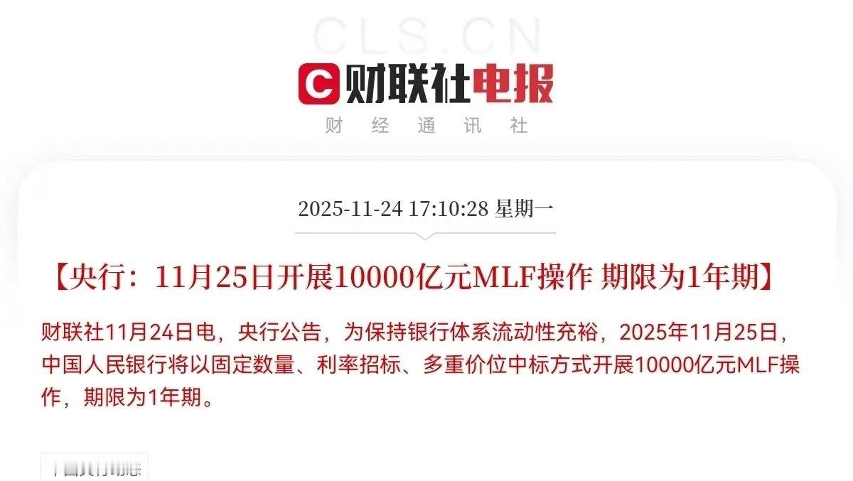 明日有望迎来中大阳线了就在刚刚,央行又突发大利好了!不出意外的话,明日A股三大指数要正式全线大反攻了,满仓的股民们,终于要迎来大回血了吧……下午5点10分,央行公告,为保持银行体系流动性充裕,11月25日开展10000亿元MLF操作,期指为1年期,这是重大利好消息,这个消息又点燃股民的希望,股民们一致认为看好明日的行情,原因是市场有了增量资金,而且是10000亿元,央行这个资金的投放量还是非常具有规模的,有了流动性的保障,市场就会有活力,就能推动股市上涨,不得不说,央行是真的很给力,最近是频繁的进行MLF操作,这向市场释放了很强的货币政策,就是宽松再宽松,这不仅能稳定市场情绪,还能增强股民们的投资信心,必须为央行点赞鼓掌👏股民们,坐稳扶好了,受央行利好消息刺激,明日大A有望起飞了,稳了!稳了!这会大反攻稳了!