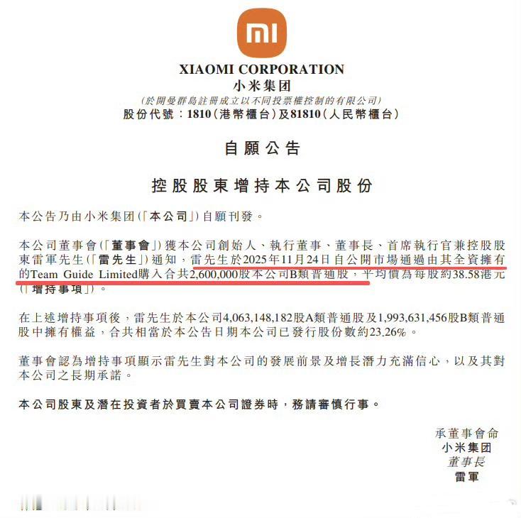 增强市场信心!雷军个人超1亿港币增持小米股票! 小米集团24日于港交所发布公告