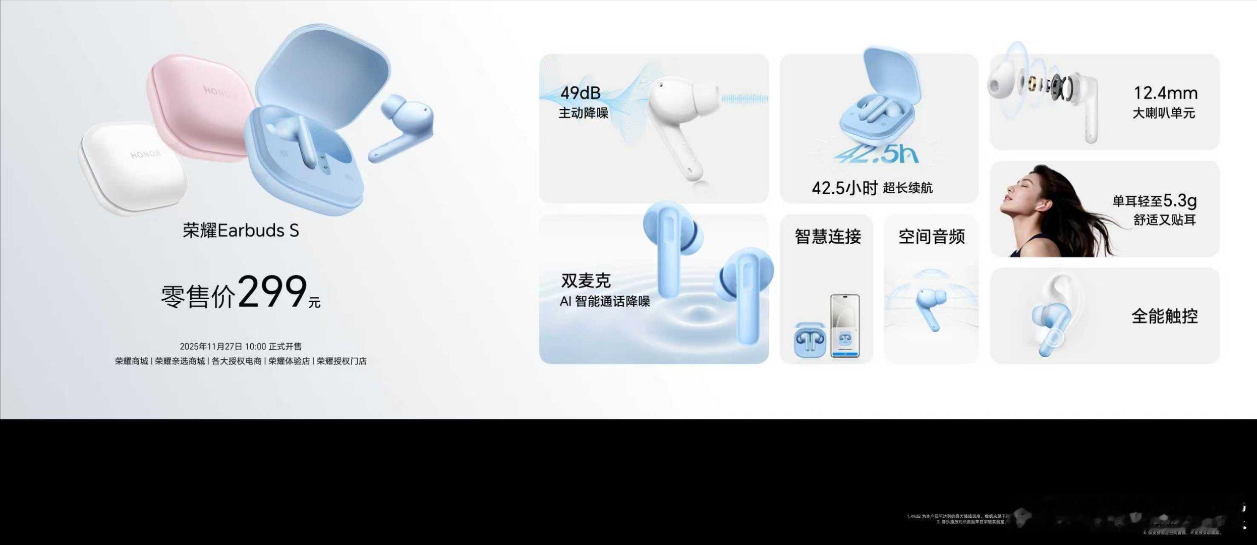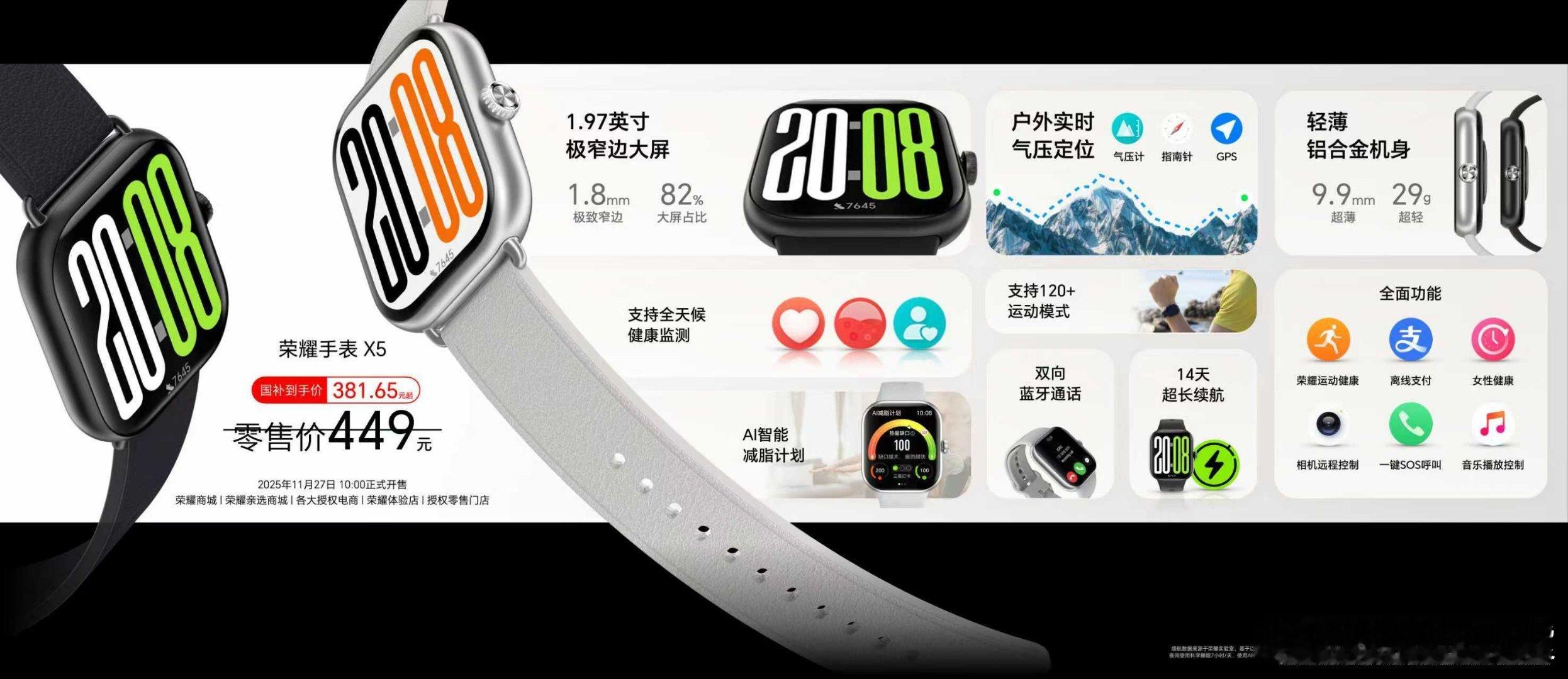除了手机,荣耀这次还发布了手表、耳机、投影仪!!!想要大屏轻薄手表?荣耀手表X5直接封神!1.97英寸巨屏+82%屏占比,29g超轻薄机身,还是档位唯一配齐游泳级防水、独立GPS和高度计的方表,120+运动模式+全天候健康检测,还有14天长续航!耳机党选款不纠结!Earbuds S 拥有49dB深度降噪+42.5小时续航,清晰听、清楚说;追求满配耳夹选荣耀耳夹耳机2 Pro,钛拱桥2.0佩戴无感,响度&低频动力较上一代提升200%,同档位独有的左右耳自适应+无线充电超贴心!在家想享大屏影音?荣耀亲选萤蜂AI投影仪Air安排上!超高亮度对比度更清晰,AI触控像平板一样好操作!