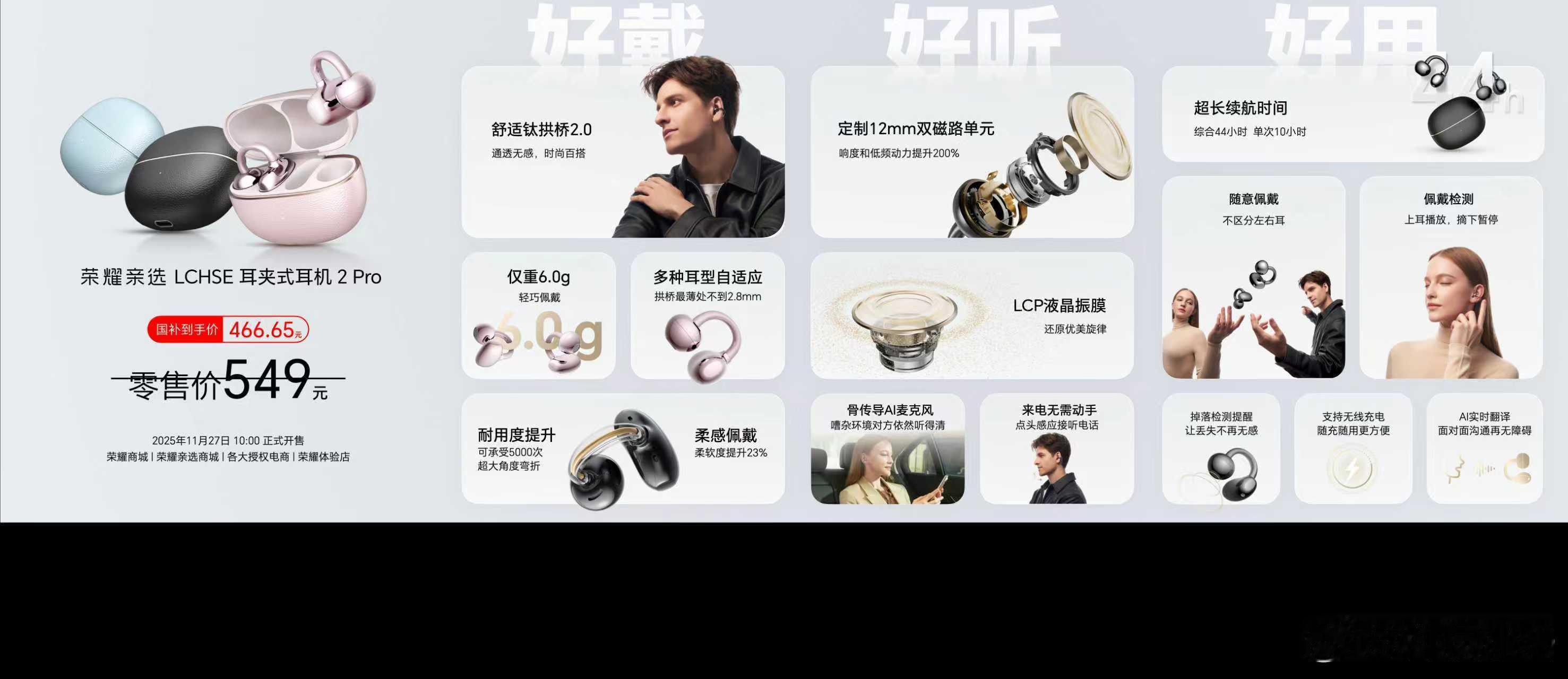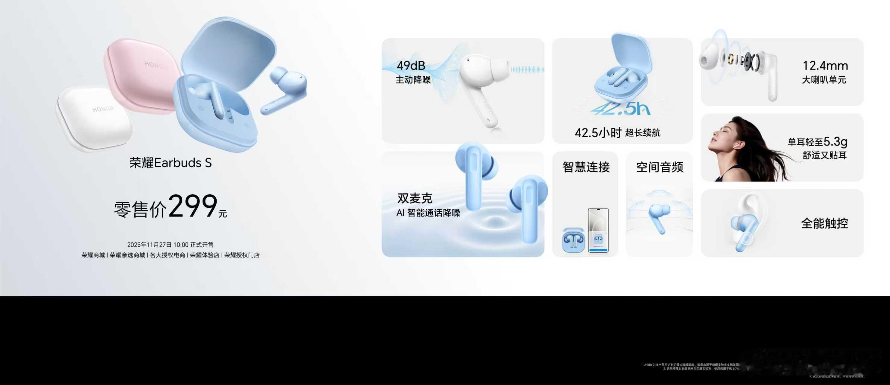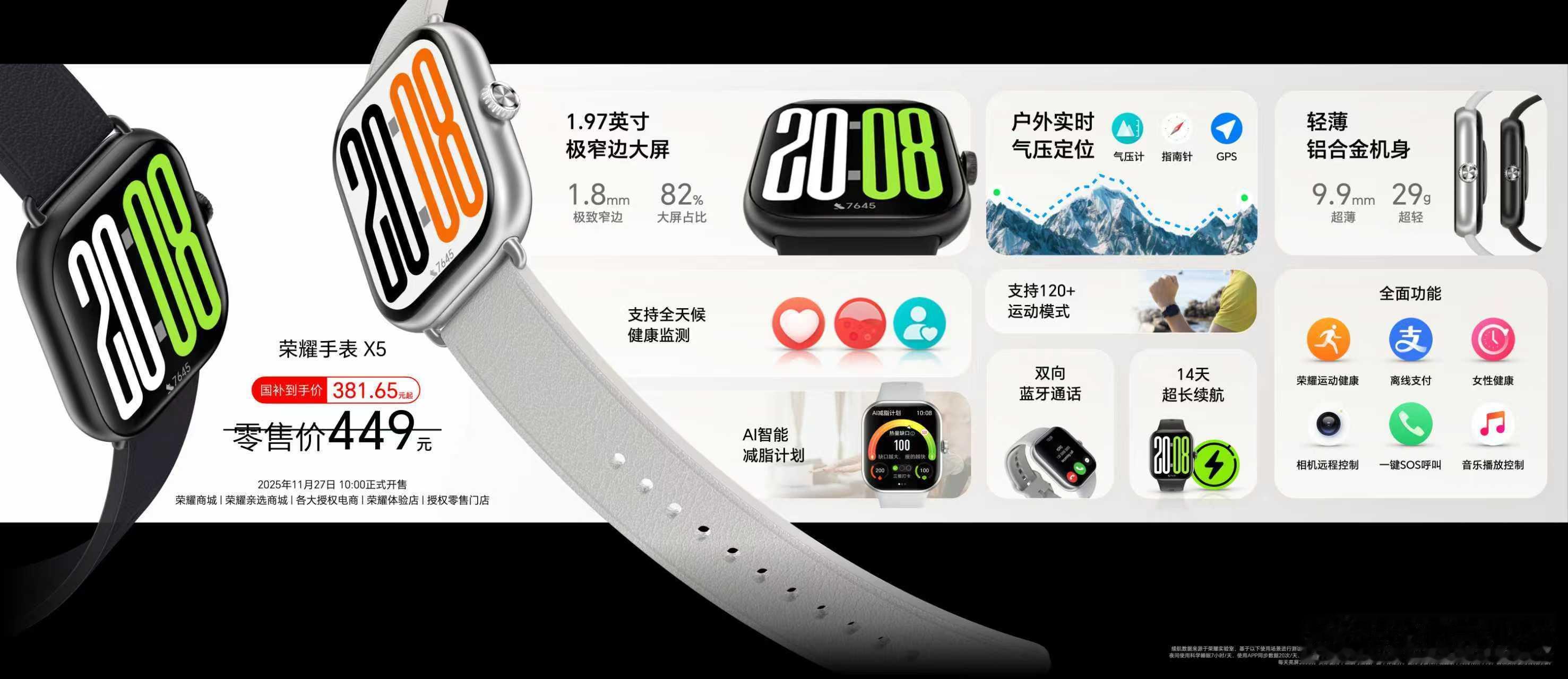 还有几款荣耀亲选新品荣耀手表X5档位唯一同时配备游泳级防水、独立GPS和高度计的智能手表,11月27日 10:00首销价449元,国补后到手价381.65元。荣耀Earbuds S耳机,拥有49dB深度降噪,超长续航可达42.5小时,11月27日 10:00首销价299元。 11月27日10:00 首销价549元,国补到手价466.65元。荣耀亲选萤蜂Al投影仪Air,拥有超高亮度和对比度,更亮更清晰,搭载AI触控黑科技,也可以像平板一样操控,点得准,更玩得爽!11月27日10:00首销价格599元,国补到手价499.8元。
