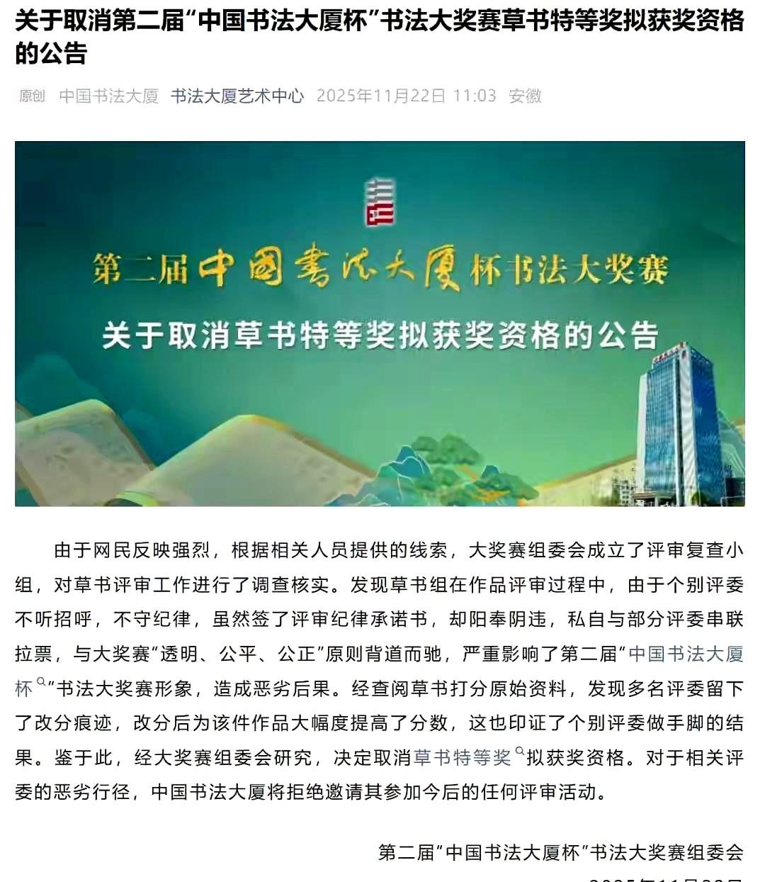 第二届“中国书法大厦杯”草书特等奖的争议事件,11月22日赛事组委会已发布公告,正式取消延志超的该奖项拟获奖资格,该评委私下改分、勾结送奖给学生的相关情况也得到了组委会调查确认。 如果是真的,那么书法圈乌烟瘴气的氛围简直让人无语了 很多书法很差,被张旭光收钱成为入室弟子后,立马成为省书法家! 当地书法家领导! 虽然他的书法实在很差! 考场作弊这在古代那可是要杀头的,现在作弊就如儿戏! 中国书法大赛,主办单位是谁? 是官方还是民间? 若是官方,必须追责+处罚。 若是民间组织的,取缔+处罚。 这明显是骗局!