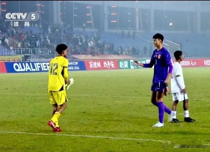 直到比赛结束,才看清中国门将秦子牛的样子……U17国足14-0东帝汶后,门将秦子牛穿越整个足球场,来跟东帝汶守门员握手。 要说本场比赛东帝汶出镜最多球员是哪位?非这位身披12号球的门将莫属,在面对中国队狂轰滥炸中,也有上佳的扑救动作。 而要说本场比赛中国队出镜最少的球员,那非门将秦子牛不可,全场比赛东帝汶只有一只射门,所以能看见秦子牛的身影寥寥无几。 比赛结束,秦子牛便从自己的门将位置,穿过整个球场,来与东帝汶门将握手,以这种方式给予对方鼓励。