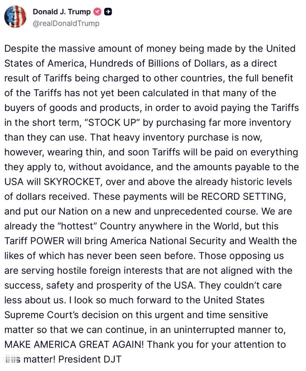 特朗普周一早些时候表示,他的关税政策的“全部益处”将很快生效,带来“前所未有的”财富和国家安全。
