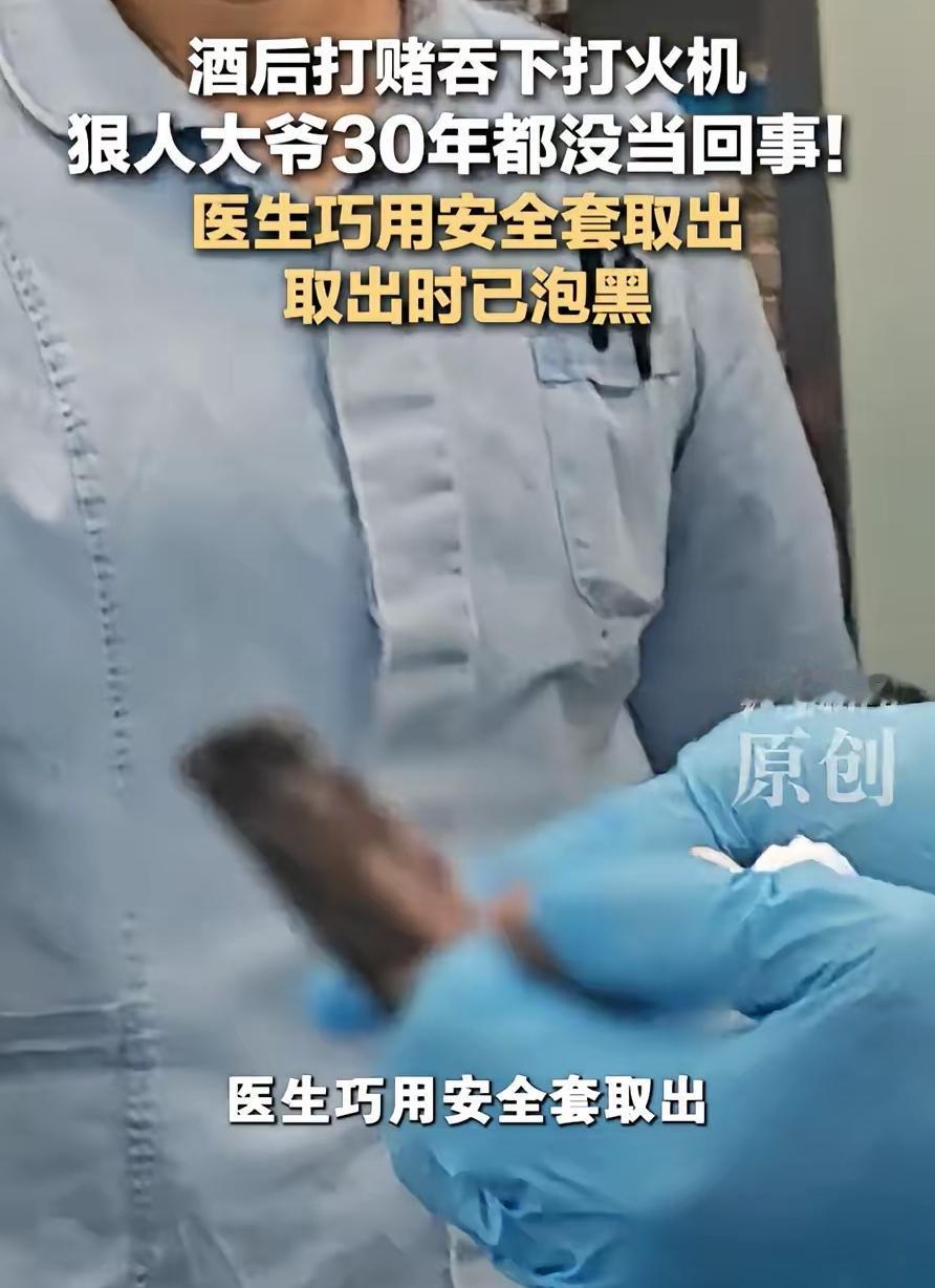 没想到安全套还有这用处!四川成都这位大爷的经历,真是刷新认知又让人捏把汗。 年轻时跟朋友喝酒逞能,酒劲一上来谁也不服软,盯着桌上的打火机就打赌“你敢吞我就敢吞”。旁人还在起哄,大爷已经梗着脖子把打火机咽了下去,当时只觉得倍儿有面子,压根没多想后果。 这一忍就是三十年,期间偶尔腹痛,他总以为是老胃病,吃点药就糊弄过去了,还天真觉得身体能“消化”掉这硬物。直到最近胀痛得直不起腰,去医院做胃镜,医生都惊了——胃里居然藏着个完整的打火机! 更绝的是医生的操作,居然用安全套当“防护袋”,送进胃里把打火机整个裹住,再用异物钳慢慢拽出来,二十分钟就解决了隐患。 真得说,年轻时候的冲动太不值当了!身体从不会替你瞒事儿,那些图一时痛快的任性,早晚会变成日后的麻烦。安全套当医疗小妙招确实聪明,但咱更该记住,别拿自己的身体赌面子。 你们身边有没有人年轻时候干过这种“硬核”蠢事?现在想想是不是还后怕?