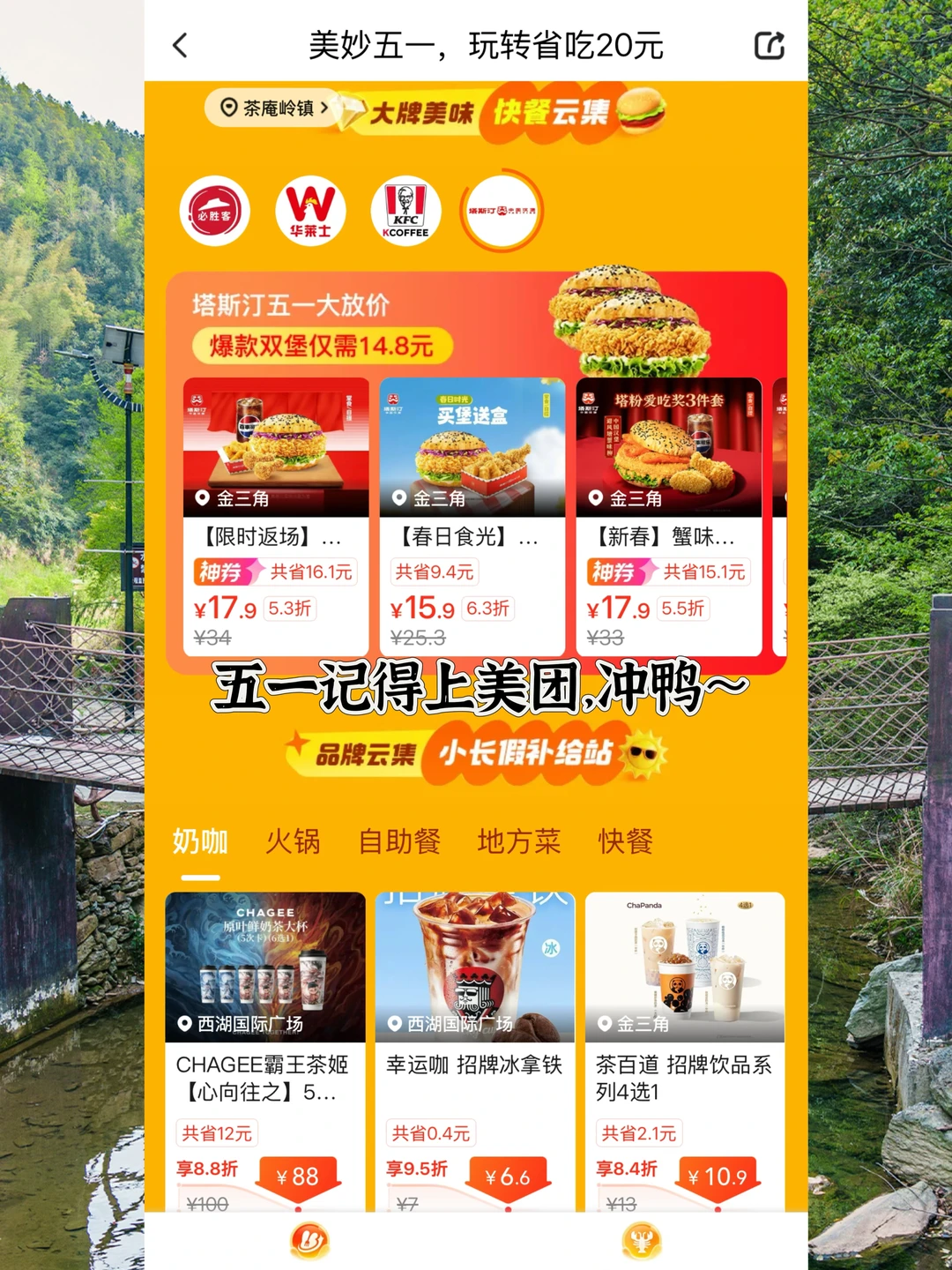 ✅五一出游,玩的开心当然也要吃的快乐呀!!五一小长假美团还上线了“美妙五一”活动,5月1日当天搜索【美妙五一】,就能抢省吃20元神券,黑钻会员优先抢哦。1号-3号都能用。里面还有超多折扣,如奶☕️,火锅,自助餐等!不管是本地躺平还是异地旅游,又或者假期遛娃,都🉑轻松get啦~美团还上线了团配业务,木屋烧烤等等大牌直接配送到位,享受悠闲露营美食。每天都有不同的大牌!优惠!像麦当劳五一金桶套餐原价129元,28号只要49.9元哦。