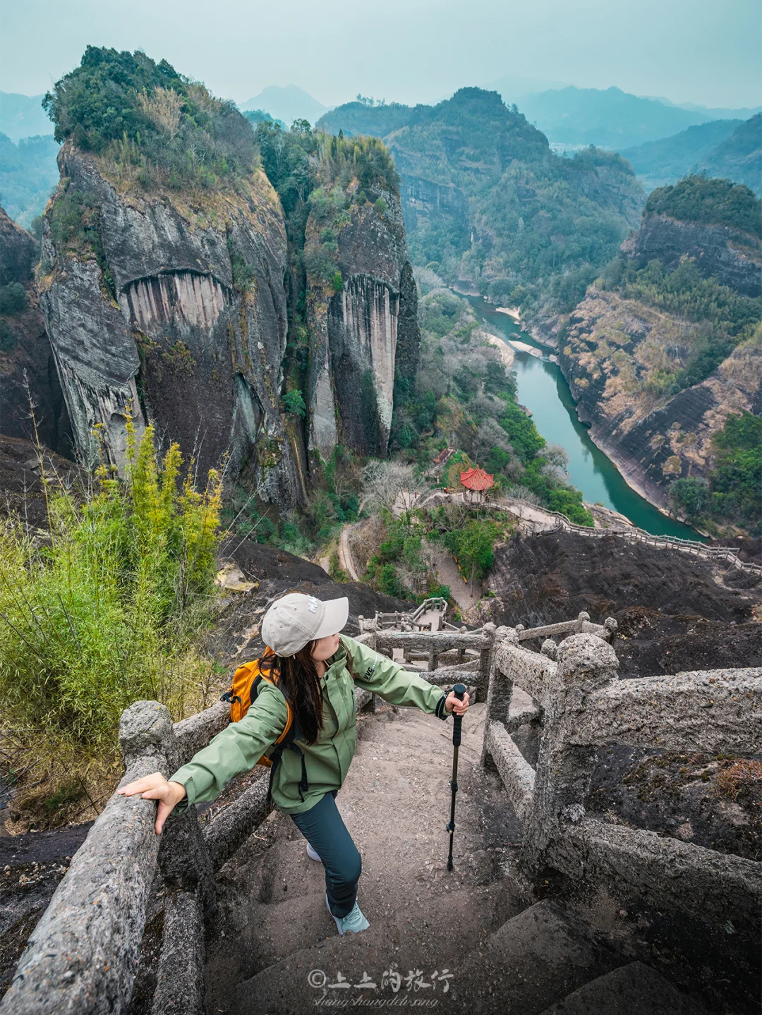 1、天游峰:半小时登顶,一览九曲的蜿蜒溪流和武夷山的丹霞地貌。