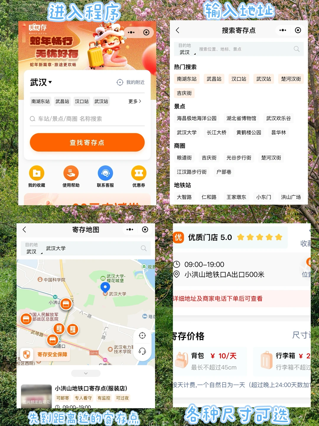 ✅武汉的早樱已经陆续开了,中樱花约3.10-25左右,晚樱约3.20-4.5!穿白色👗或者日系更出片,赏花期间来武汉的小伙伴行李🧳可以放在🔍『无忧存行李寄存』这个存行李的小程序有一万➕的寄存点,在各大景区,车站,🚄🚇站,公园等都有点位哦,有大中小不同的柜子,不用提着行李到处走真的很赞。