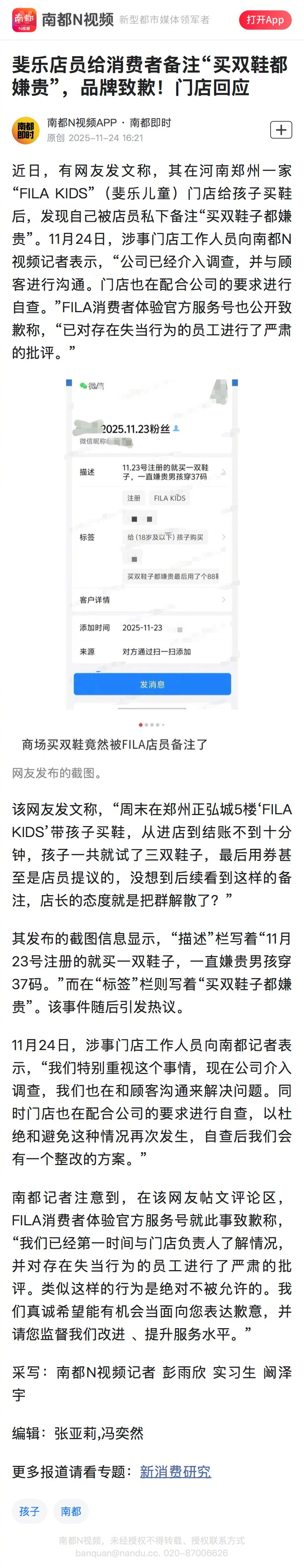 【斐乐店员给消费者备注“买双鞋都嫌贵”,品牌致歉!门店回应】近日,有网友发文称,其在河南郑州一家“FILA KIDS”(斐乐儿童)门店给孩子买鞋后,发现自己被店员私下备注“买双鞋子都嫌贵”。11月24日,涉事门店工作人员向南都N视频记者表示,“公司已经介入调查,并与顾客进行沟通。门店也在配合公司的要求进行自查。”FILA消费者体验官方服务号也公开致歉称,“已对存在失当行为的员工进行了严肃的批评。”南都N视频记者 彭雨欣 实习生 阚泽宇