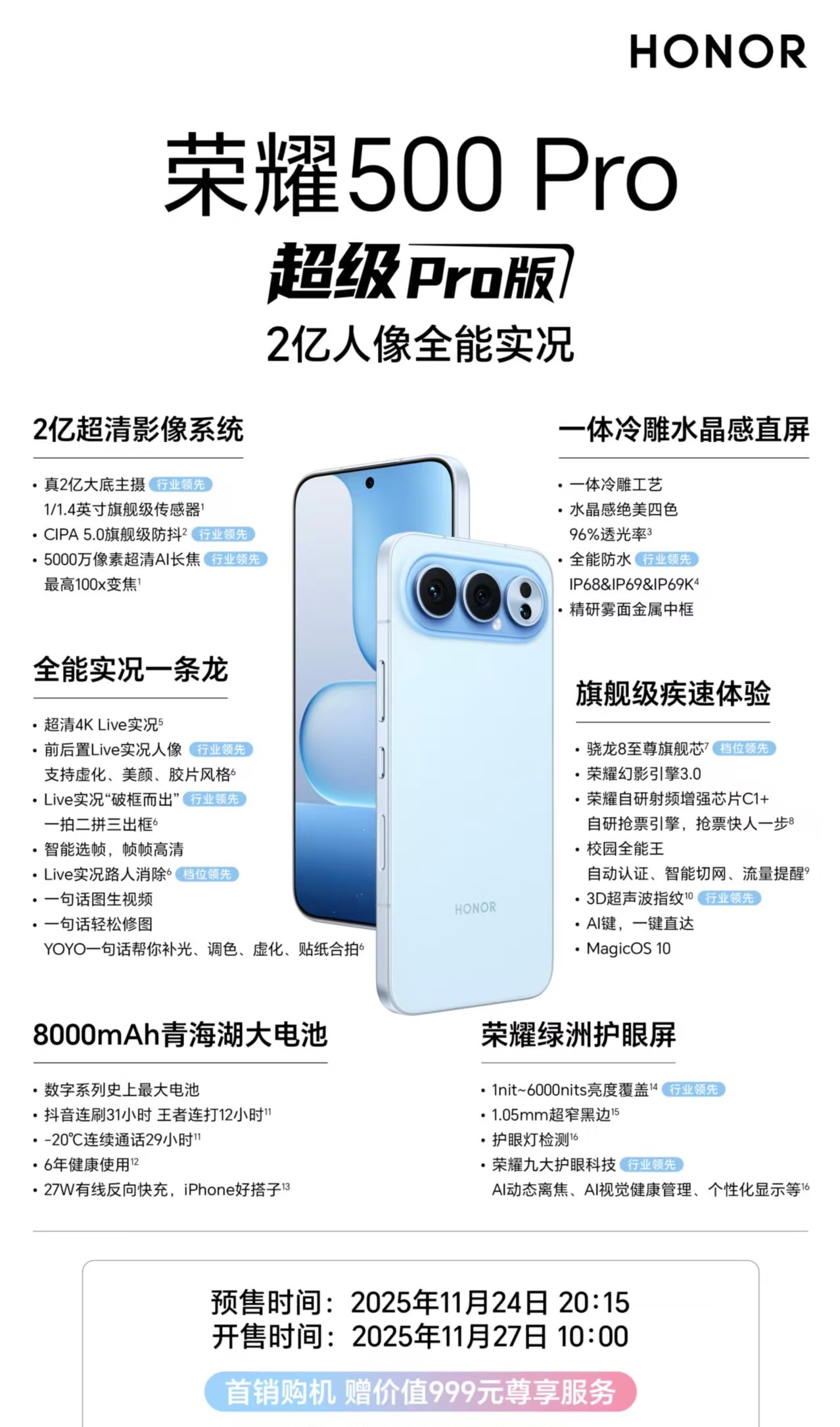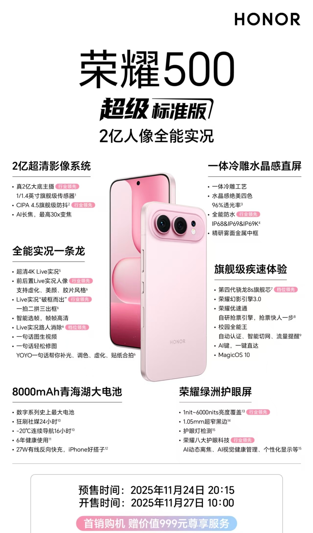 荣耀500系列正式发布,接受预定,首销赠365天只换不修+一年后盖保+两年电池保