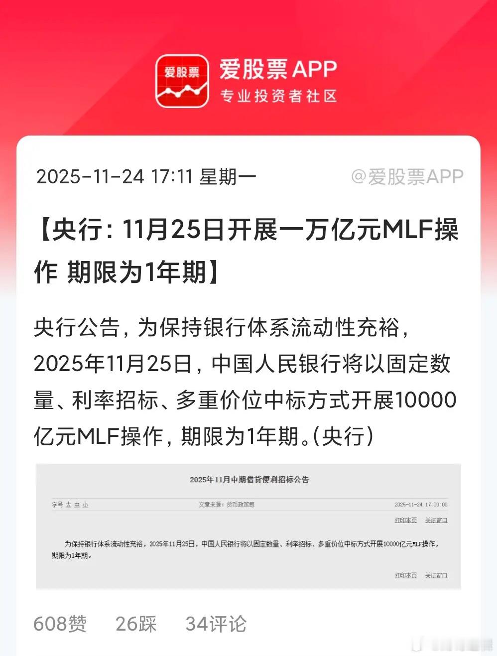 老乡别走,央妈带着一万亿增量资金来了!所谓的1万亿的MLF操作,通俗说就是:央妈给银行“发红包”了,1万亿的资金明天到位,银行能用满1年。不过具体利率还没说,明天银行们竞标,谁报的利率合适就给谁钱。总之,1万亿的规模不算小,一是央行想提前给银行备足“弹药”,二是稳住市场情绪,告诉大家流动性管够。这个对A股肯定是积极信号,水牛依然没有变。