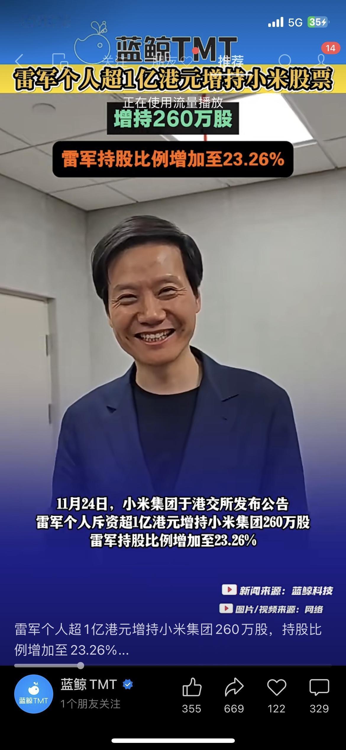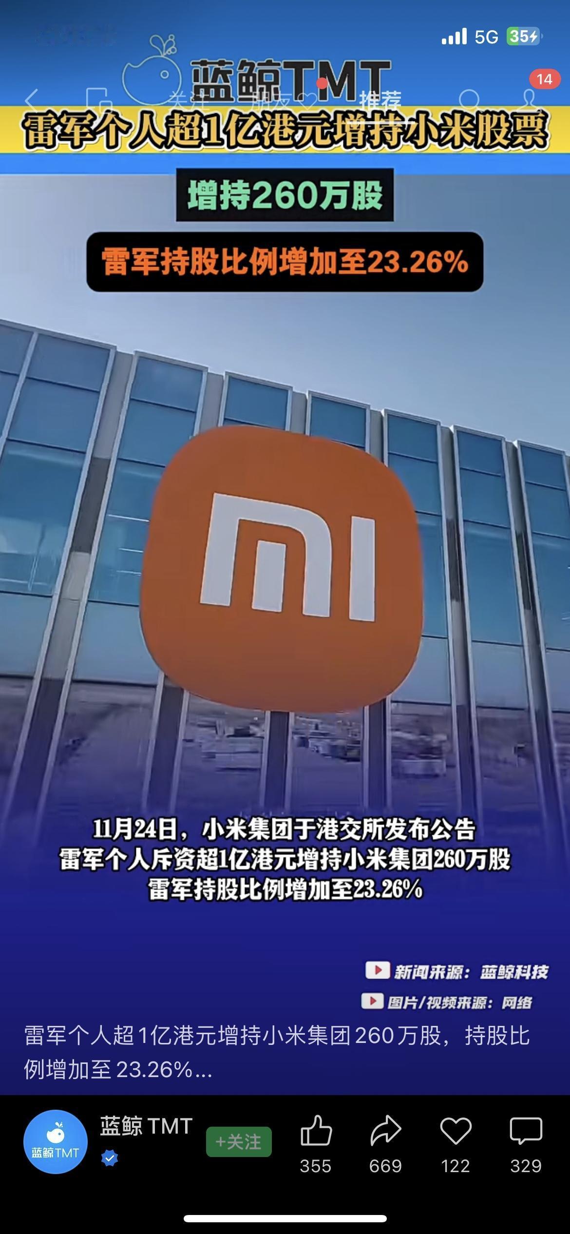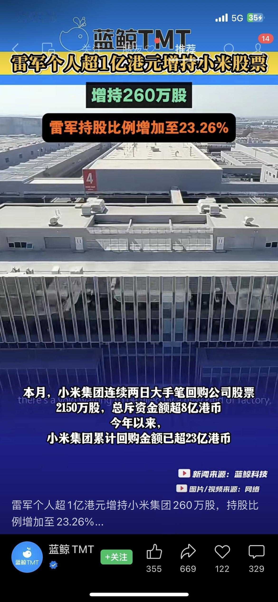 雷军增持小米:大佬亲自下场,小米未来稳了? 最近小米的消息挺多,股价也一直在波动,很多人都在猜接下来会怎么走。没想到,雷军自己直接出手了! 据公告,雷军最近增持了小米的股票,真金白银砸进去,这可不是闹着玩的。一般公司老板亲自增持,都是对自家企业特别有信心的表现。毕竟,没人比他更了解小米的真实情况。 小米现在手机业务还在全球拼杀,智能汽车又刚起步,正是需要资金和信心的时候。雷军这个举动,不仅稳定了市场情绪,也让很多小股东心里踏实了不少。 大家觉得,小米接下来能走出低谷吗?你会跟着大佬一起加仓吗?小米发展前景 雷军小米市值
