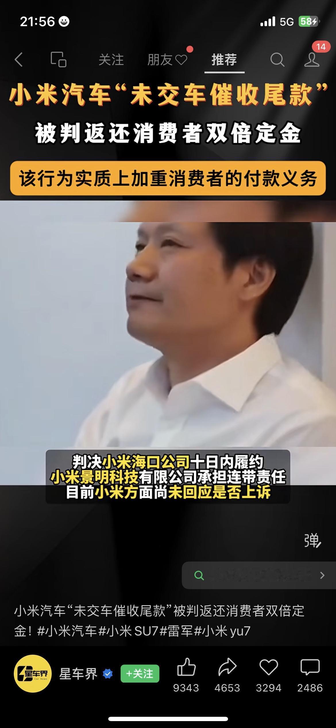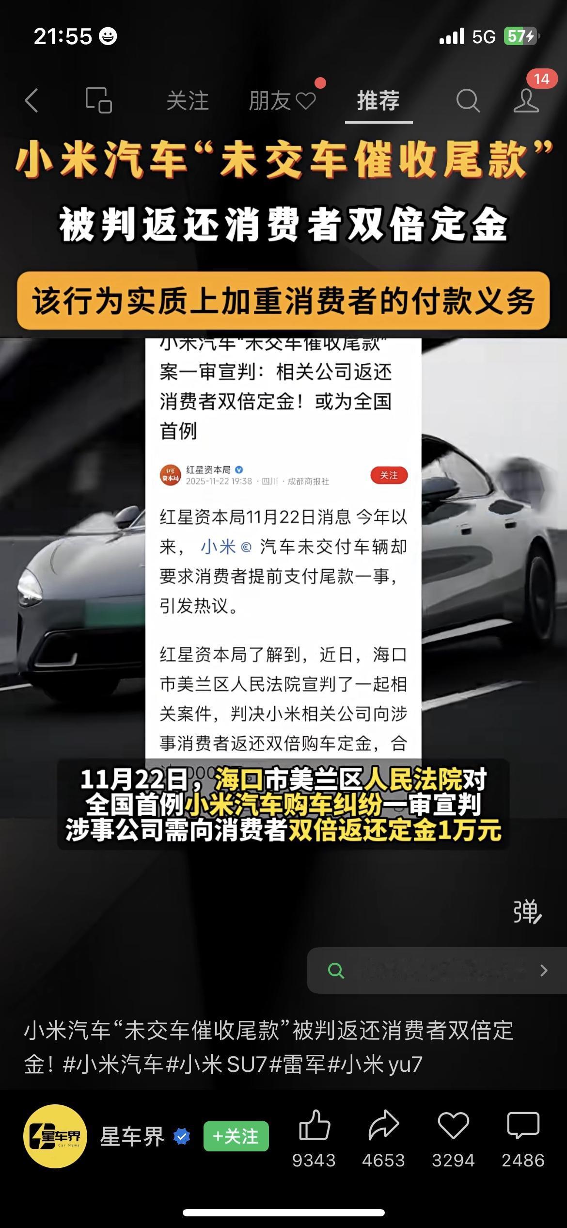 小米汽车翻车:未交车就催尾款,被判赔双倍定金! 小米汽车这波是真栽了——有消费者订车后,车还没交就被催着付尾款,结果把小米告了,海口法院直接判小米赔双倍定金(1万块),还是全国首例。 法院说这是“加重消费者义务”,现在车企交付压力大,但也不能这么操作啊。你们订过车没?遇到过这种糟心事不?小米汽车投诉