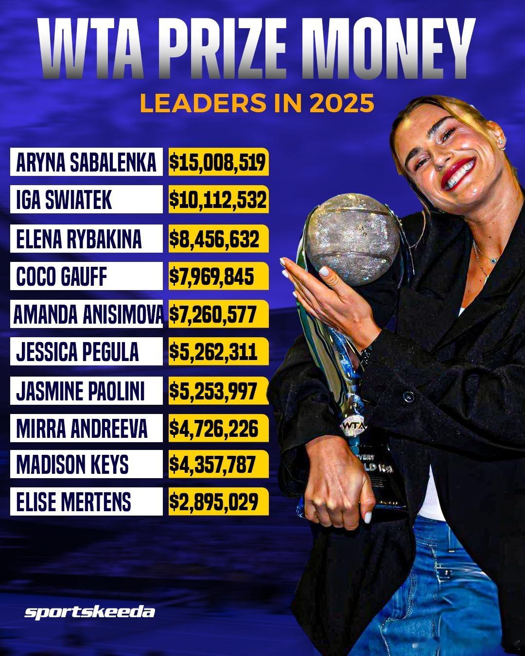 今年WTA奖金数:1、萨巴伦卡15,008,5192、斯瓦泰克10,112,