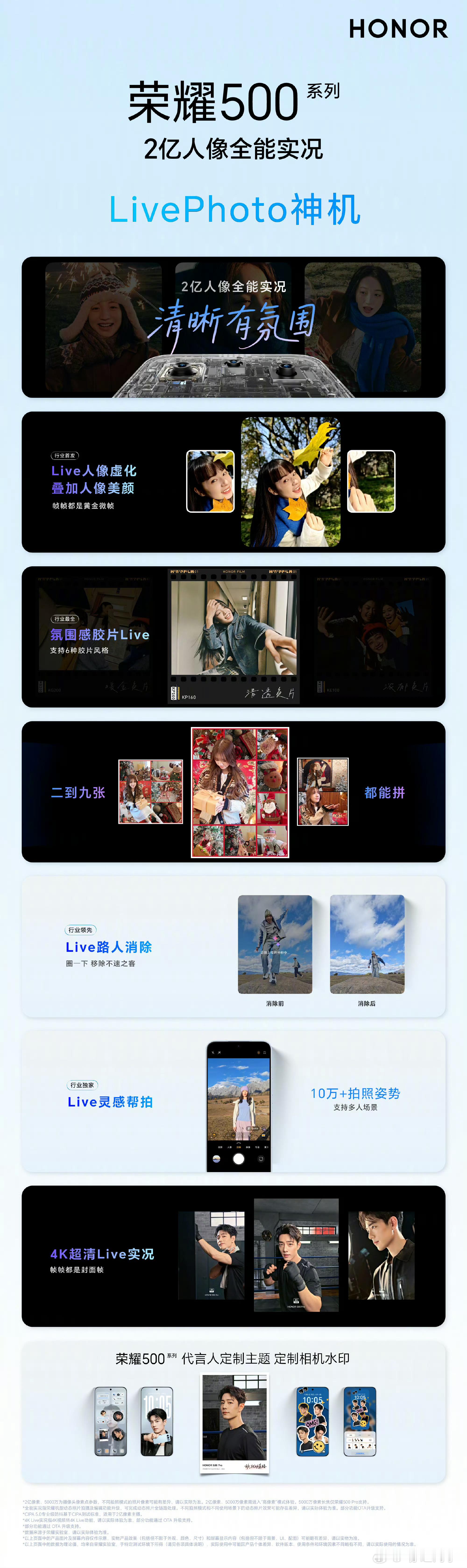 荣耀500系列刚刚正式发布,这波升级可以说是“刀法精准,全系越级”!新系列最大的亮点就是全系搭载骁龙8系旗舰芯片,标准版用上骁龙8s Gen4,Pro版更是一步到位上了骁龙8至尊版,性能直接拉满。影像系统是另一个重头戏,主摄全系标配2亿像素大底传感器,Pro版还额外拥有一颗5000万像素的潜望式长焦镜头,支持3倍光学变焦,并且带来了行业唯一的前后置Live人像美颜与虚化、以及非常实用的Live路人消除等创新功能。续航方面更是夸张,全系内置了8000mAh的青海湖电池,彻底告别电量焦虑。此外,Pro版还独家配备了湿手也能秒解锁的3D超声波指纹,并且支持顶配的IP68/IP69/IP69K防护等级,实用性直接拉满。总的来说,荣耀500系列在性能、影像、续航和细节体验上都做到了“超级标准”