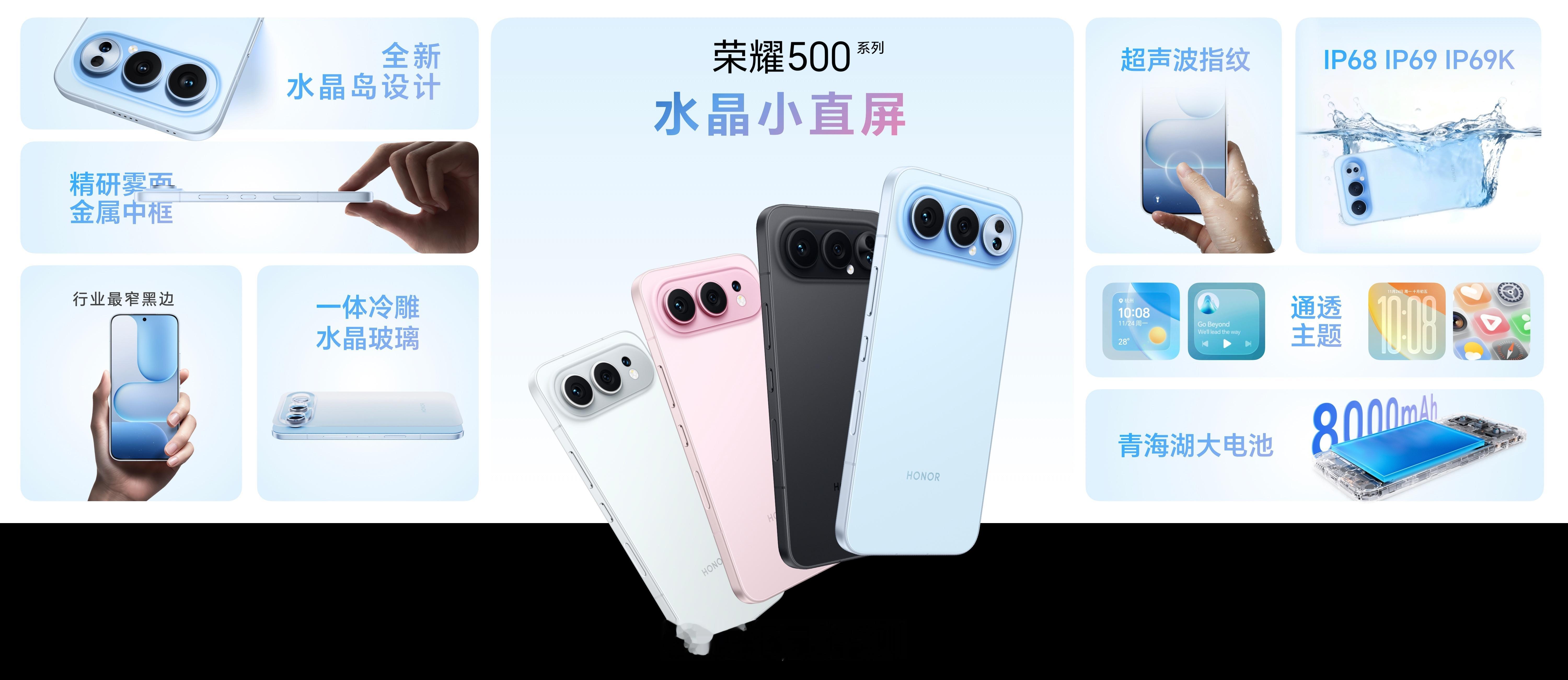 系列沉浸体验超可靠!荣耀500系列应用全新屏幕生产工艺,实现了行业最窄1.05mm黑边,提供无界沉浸的视觉享受。同时,新机还支持IP68&IP69&IP69K行业至高防水等级,滴水不进、一尘不染,带来更加安全、可靠的使用体验。荣耀500 Pro配备旗舰同款超声波指纹,湿手秒解,响应迅速,在细节处彰显旗舰级品质。