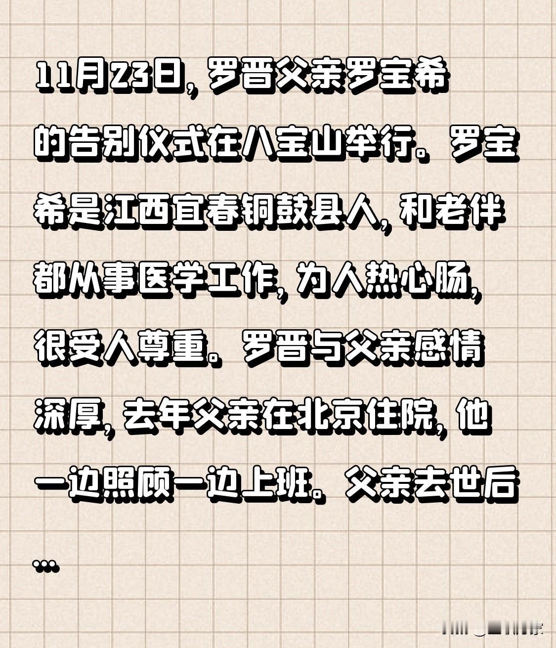 11月23日,罗晋父亲罗宝希的告别仪式在八宝山举行。罗宝希是江西宜春铜鼓县人,和